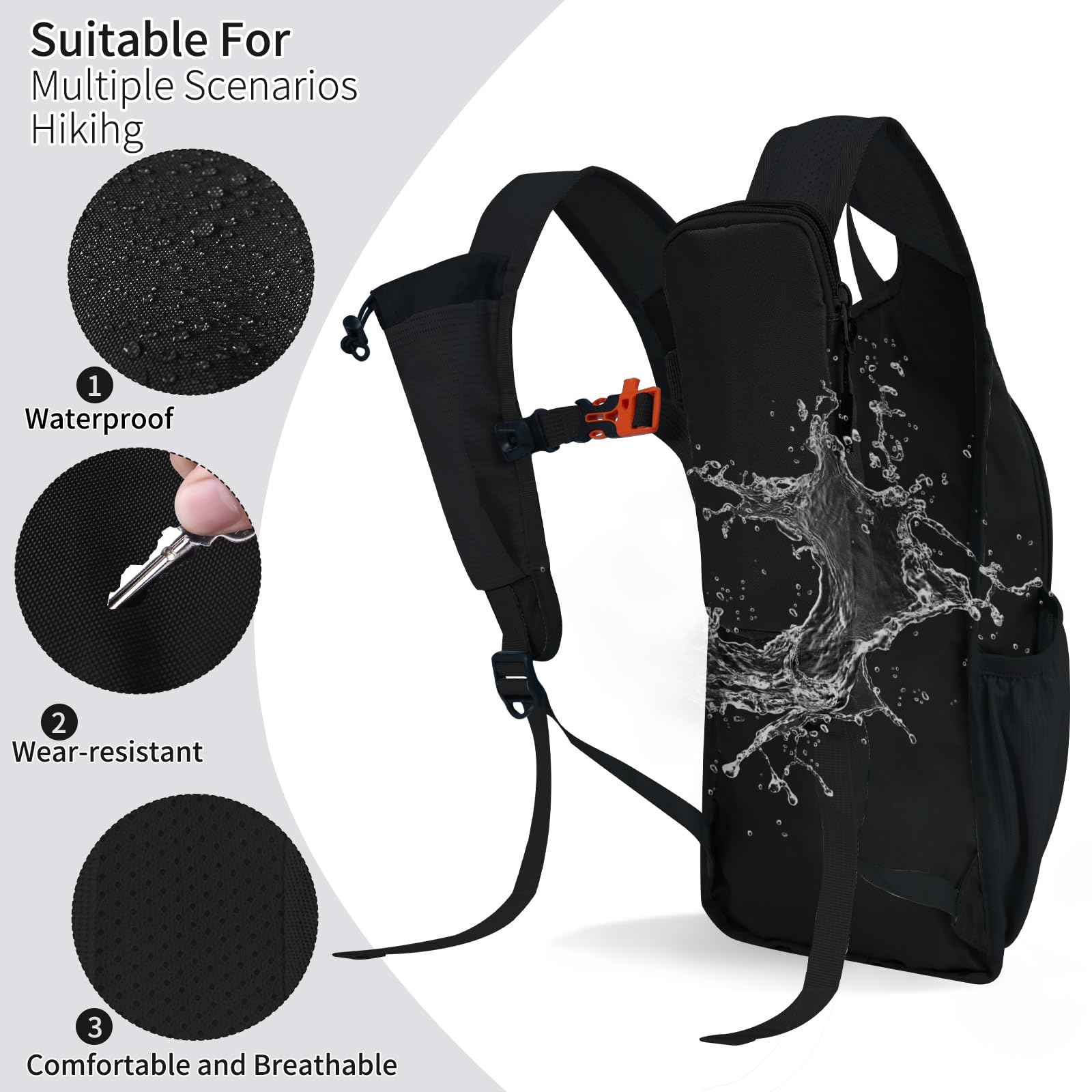HIGH-QUALITY MATERIALS: the day hiking backpack is made of high-density polyester waterproof fabric and high-quality zippers, the shoulder strap is made of breathable fabric, reinforced at the stress point, durable and not easy to tear, outdoor hiking, even if it rains, it will not wet important items inside the Small hiking backpack.