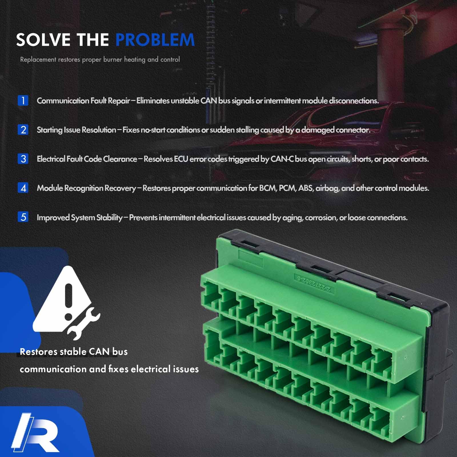 [Solve the Problem]: ①Communication Fault Repair – Eliminates unstable CAN bus signals or intermittent module disconnections; ②Starting Issue Resolution – Fixes no-start conditions or sudden stalling caused by a damaged connector; ③Electrical Fault Code Clearance – Resolves ECU error codes triggered by CAN-C bus open circuits, shorts, or poor contacts; ④Module Recognition Recovery – Restores proper communication for BCM, PCM, ABS, airbag, and other control modules