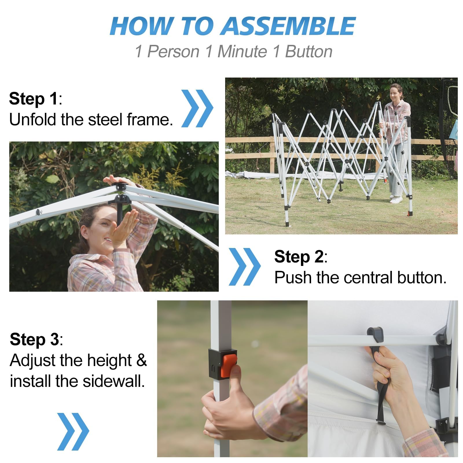 ๐ข๐ป๐ฒ-๐๐๐๐๐ผ๐ป ๐ฃ๐๐๐ต ๐ฆ๐ฒ๐๐๐ฝ: The 10x10 pop up canopy features an innovative one-touch central locking system that simplifies the assembly process to less than a minute. Simply press the central locking mechanism and the entire structure snaps securely into place without the need for any tools.The installation can be completed quickly by 1-2 people, making it ideal for outdoor scenes