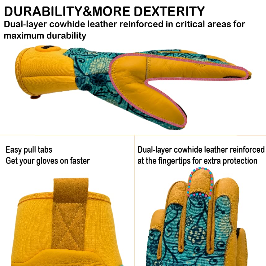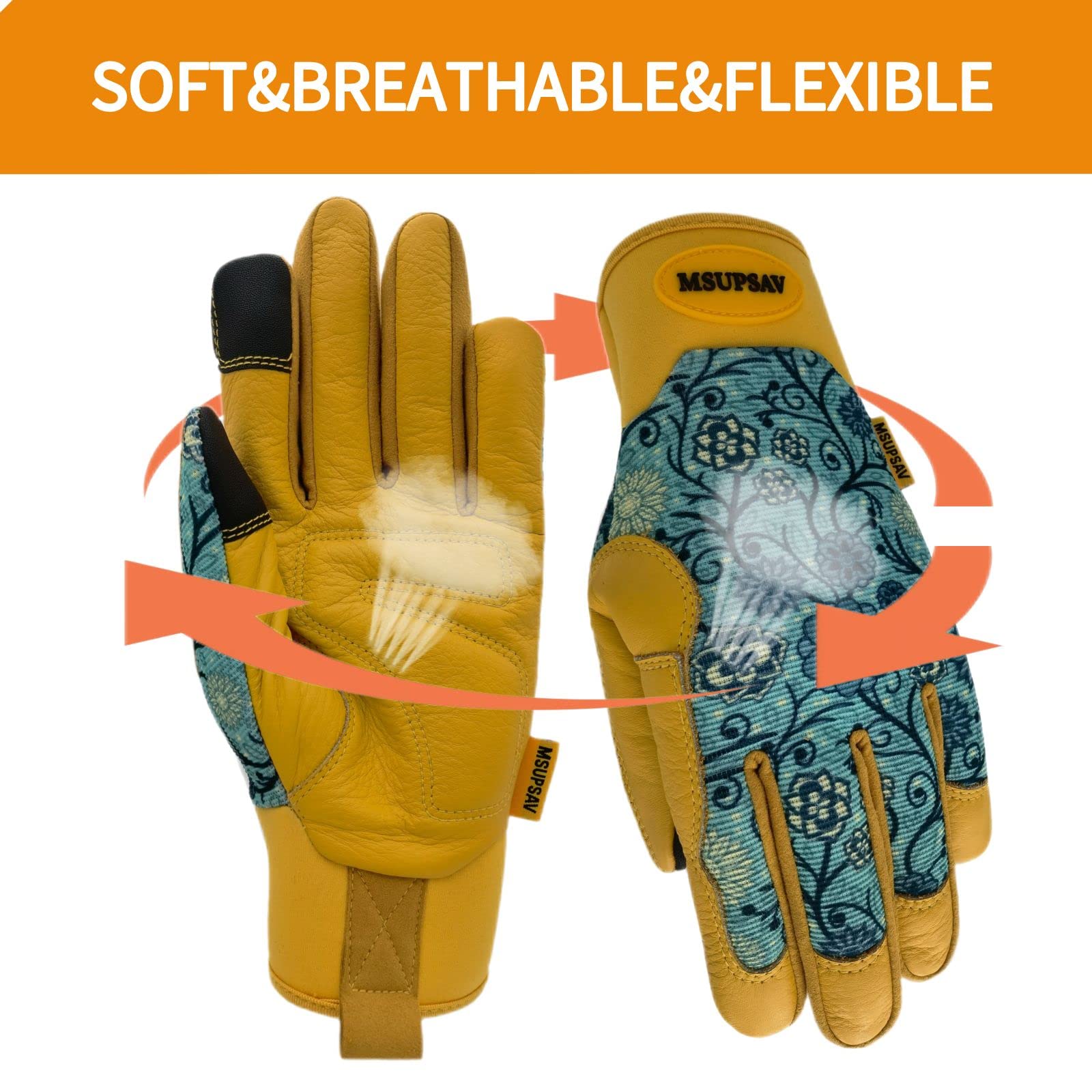 【MSUPSAV GARDEN GLOVES FOR GARDENING】Stretchable double-layer spandex design back keep your hands flexible,breathable&comfortable on the job. Leather with foam padded palm and reinforced fingertips increase durability.Supportive adjustable with hook& loop strips closure cuff for snug secure fit.