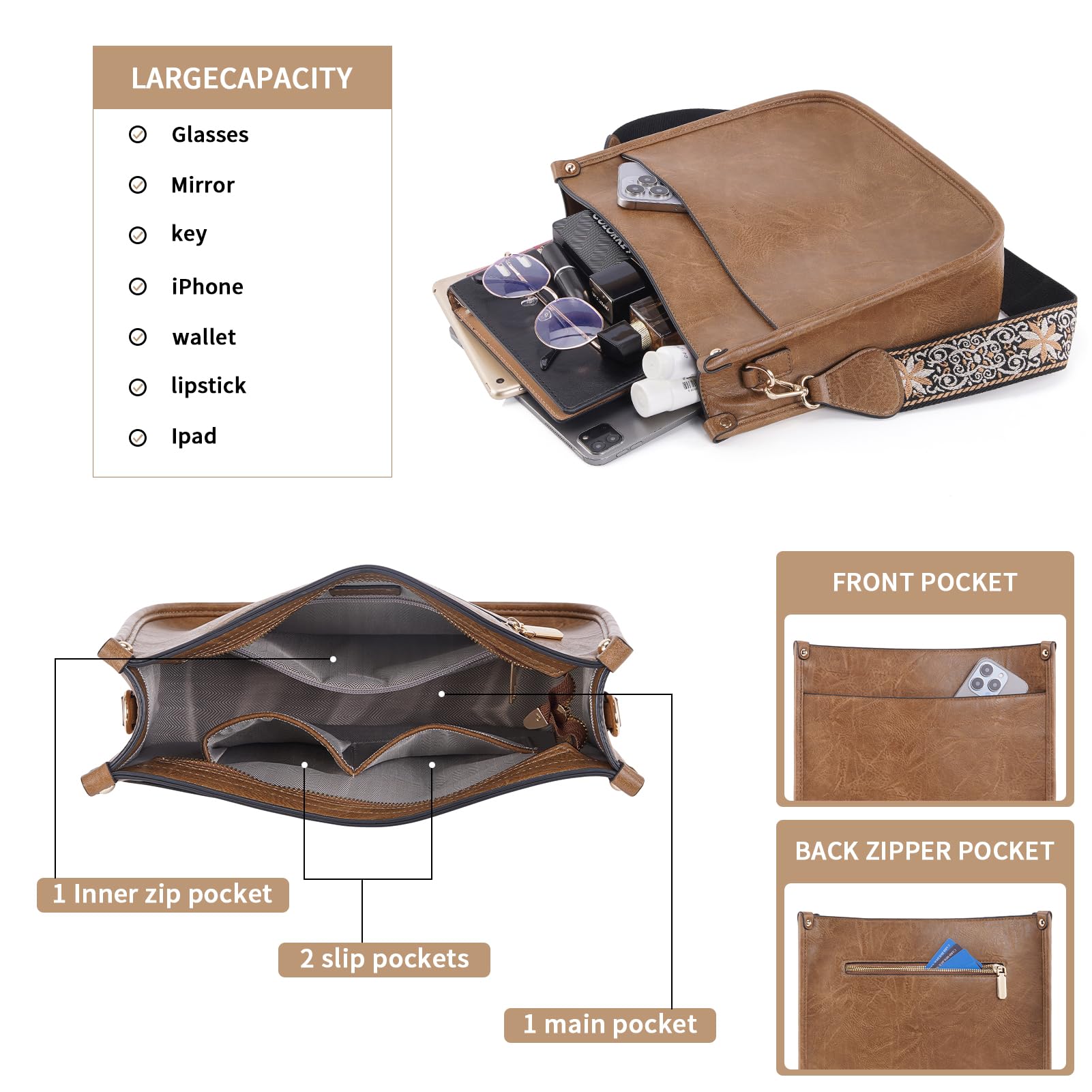 Crossbody Bag Structure:Internal structure is one main compartment including 1 main pocket,1 inner zipper pocket,2 slip pockets-cell phone pocket and ID card slot.External structure including 1 metal magnetic buckle pocket and 1 back anti-theft pockets,come with metal zipper closure,main pocket and back pocket antitheft zipper design-double antitheft to protect your property safety
