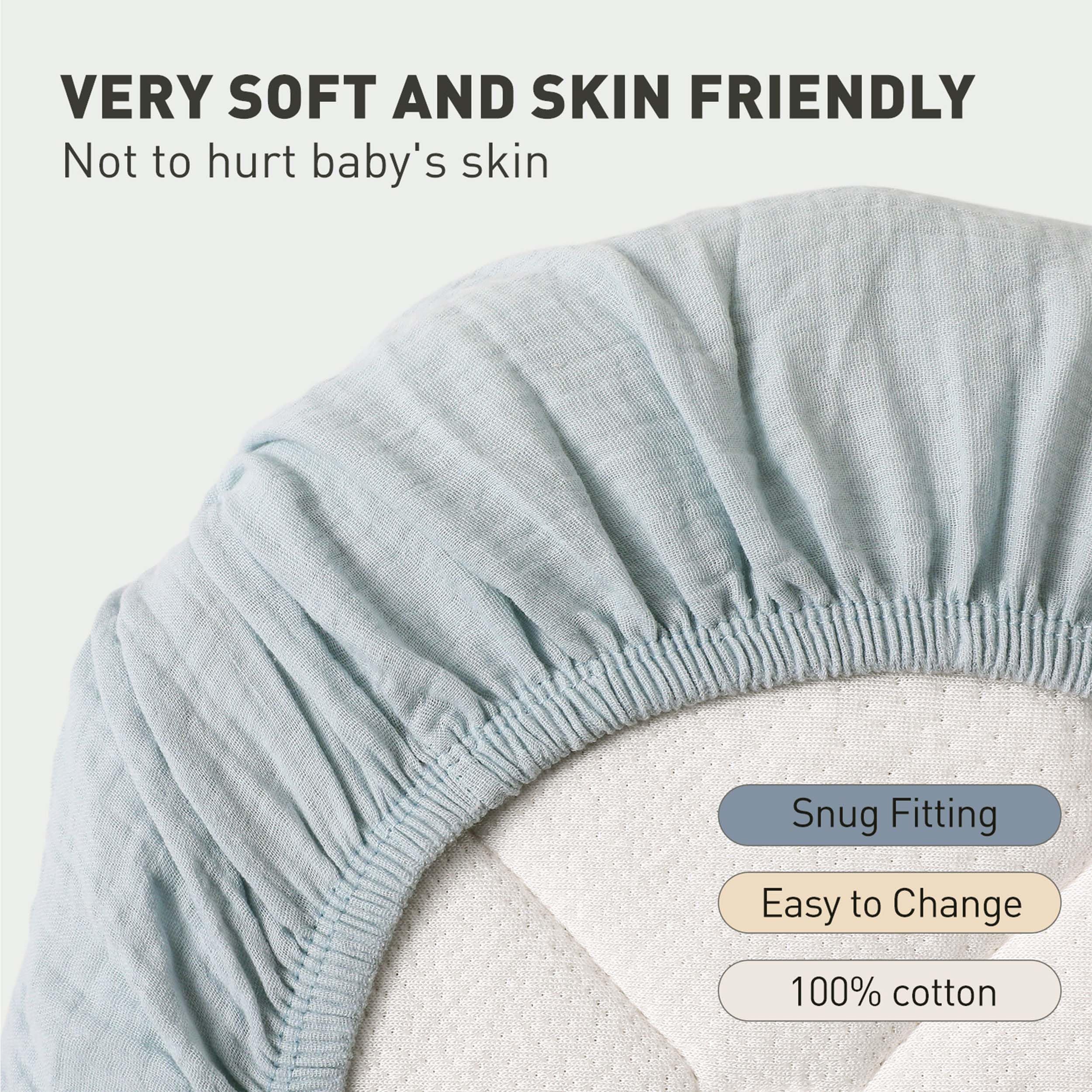 SKIN-FRIENDLY TO BABY: These muslin bassinet sheets are made of 100% cotton (Muslin) for maximum breathable with skin-friendly soft touch. Our bassinet sheets are hypoallergenic, gentle on baby's delicate skin. It will provide super comfortable sleeping environment for your little one.