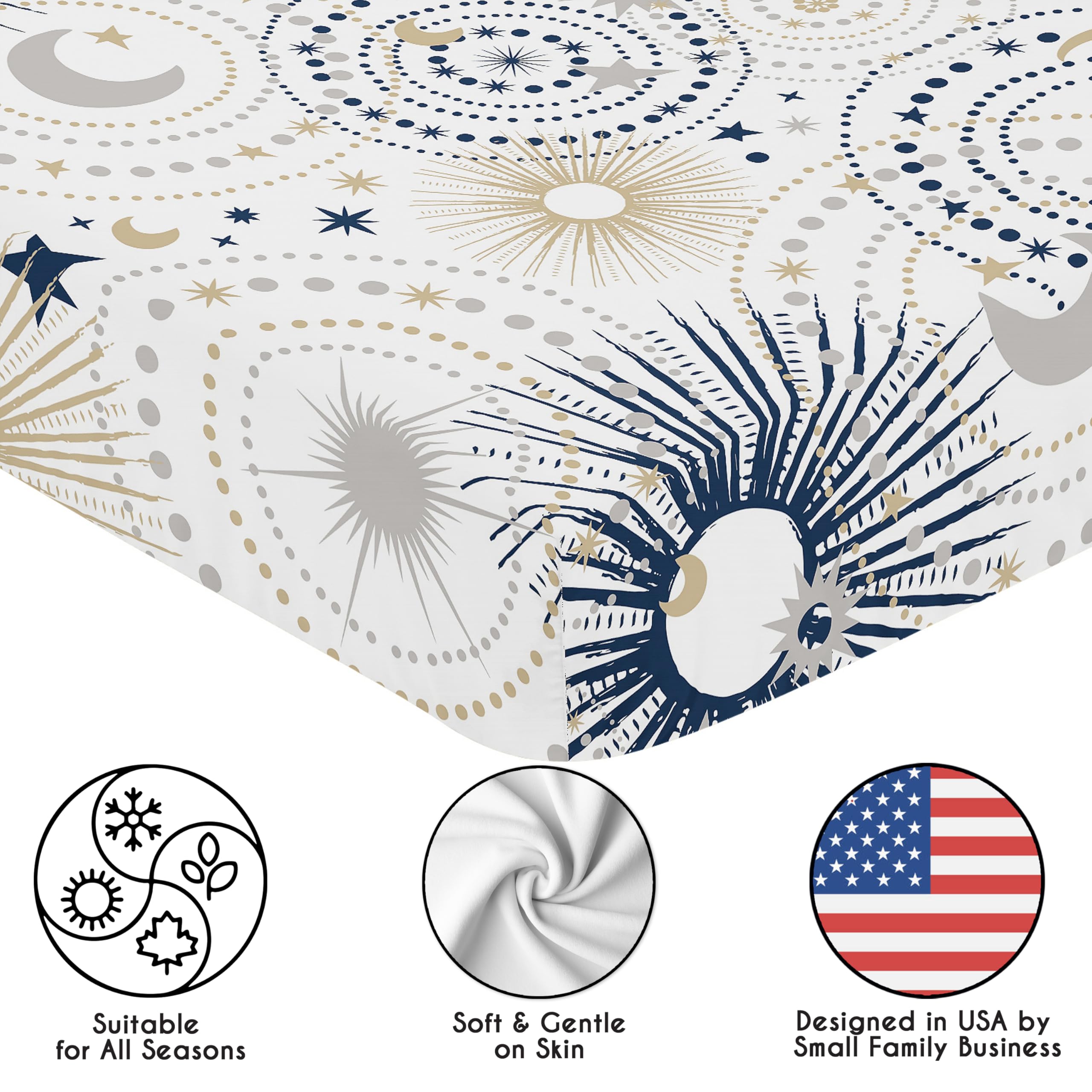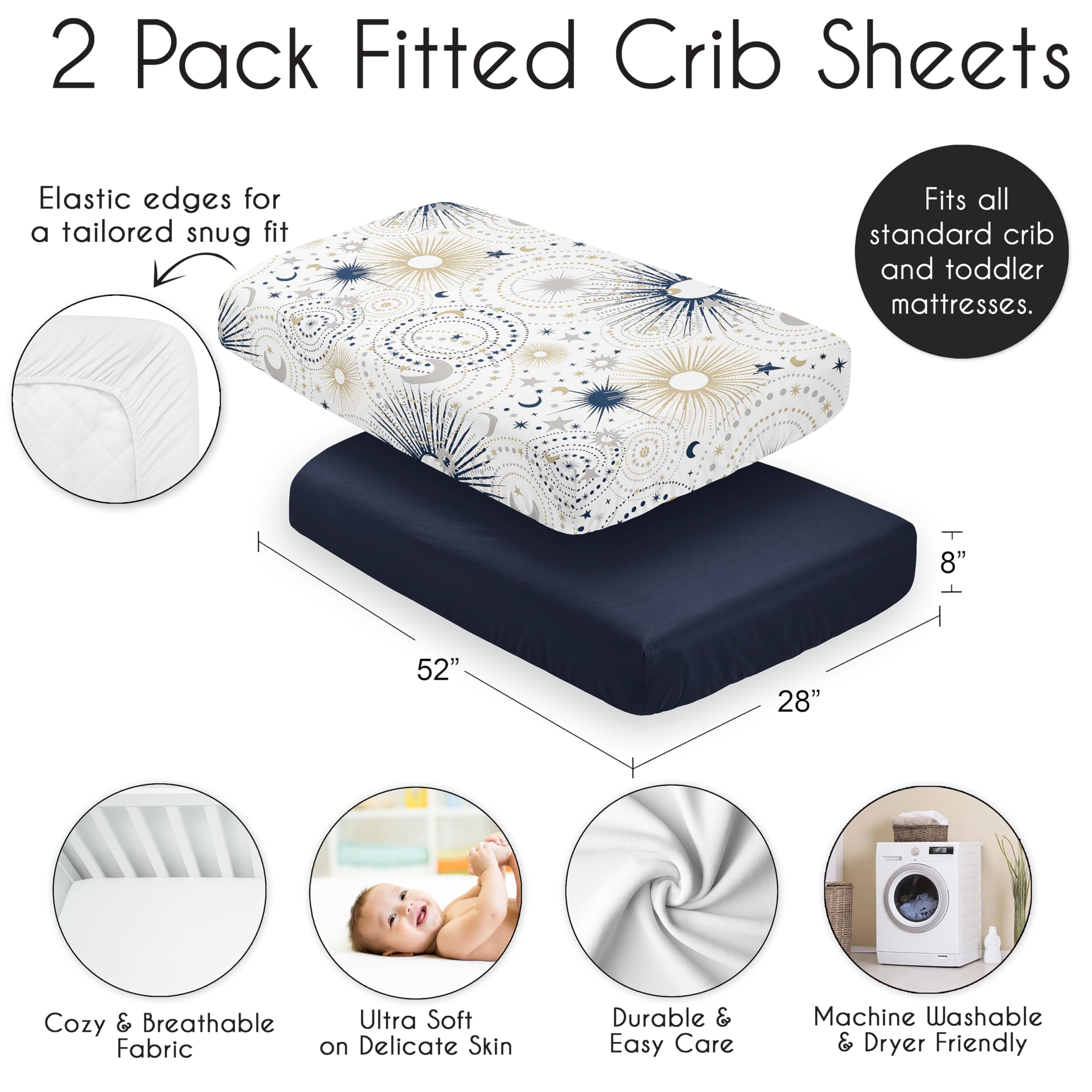 SNUG FIT: Includes: (2) Fitted Bassinet Sheets: 32in. x 19in. x 4in. each. Our sheets fit snugly, with premium elastic sewn around the bottom edge for a secure fit on most standard bassinets, pack n play bassinets, cradles, beside sleepers, & oval, hourglass and rectangular mattress shapes. These microfiber bassinet cover sheets feature a design of a solid navy paired with a blue, grey, gold, silver and gray celestial, outer space, stars and moons print. WILL NOT FIT STANDARD SIZE OR MINI CRIBS.