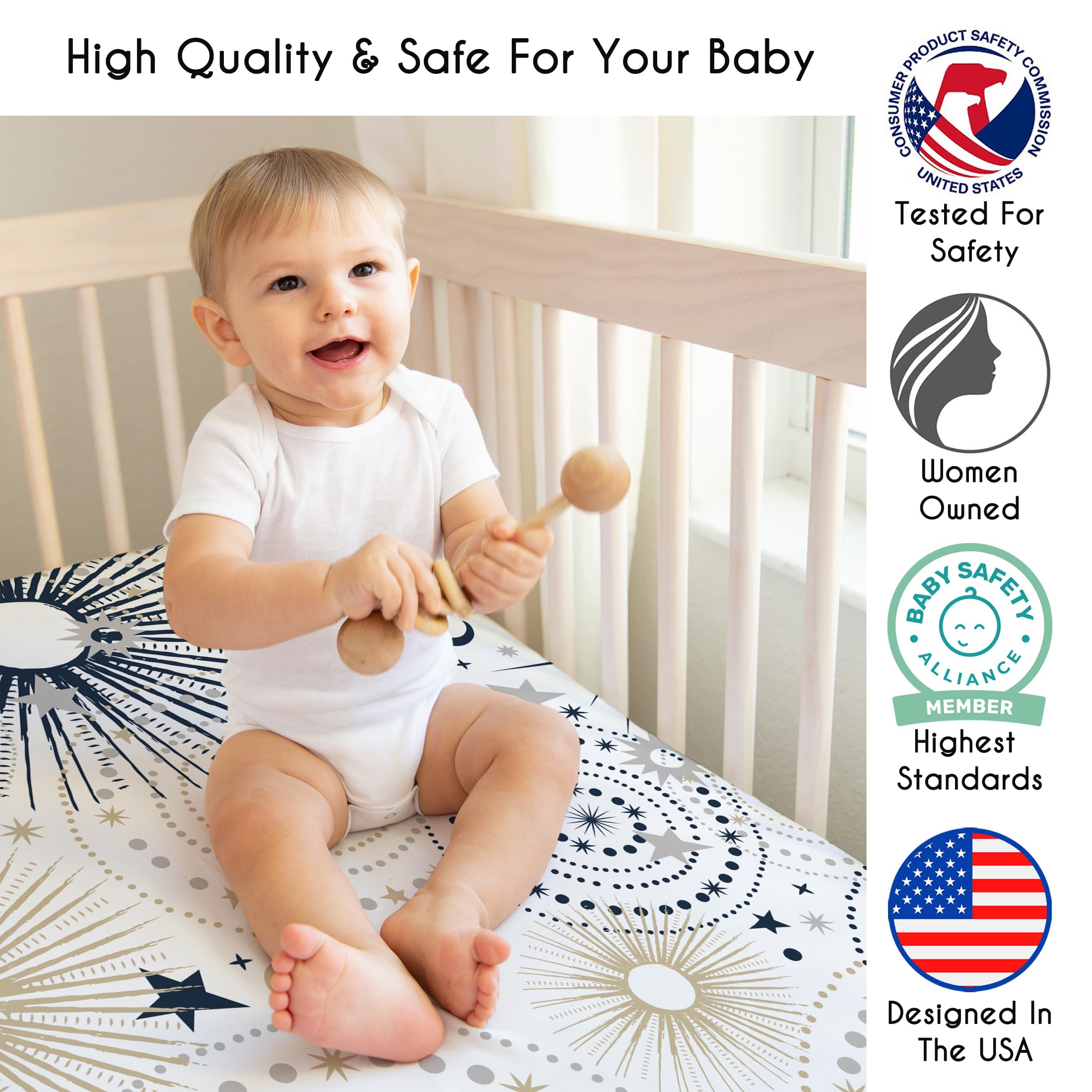 DESIGNED IN THE USA: By real parents who understand the need for comfort, practicality, and style. Sweet Jojo Designs is a small, women owned business. The mom's on our team know a fitted bassinet sheet is first priority for your baby essentials to ensure a restful night of sleep. We use top fabrics & designs to create soft bassinet sheets that are stretchy & comfortable for your infant. We've studied the latest trends in stars space bassinet sheets for baby boy to bring you the finest product.
