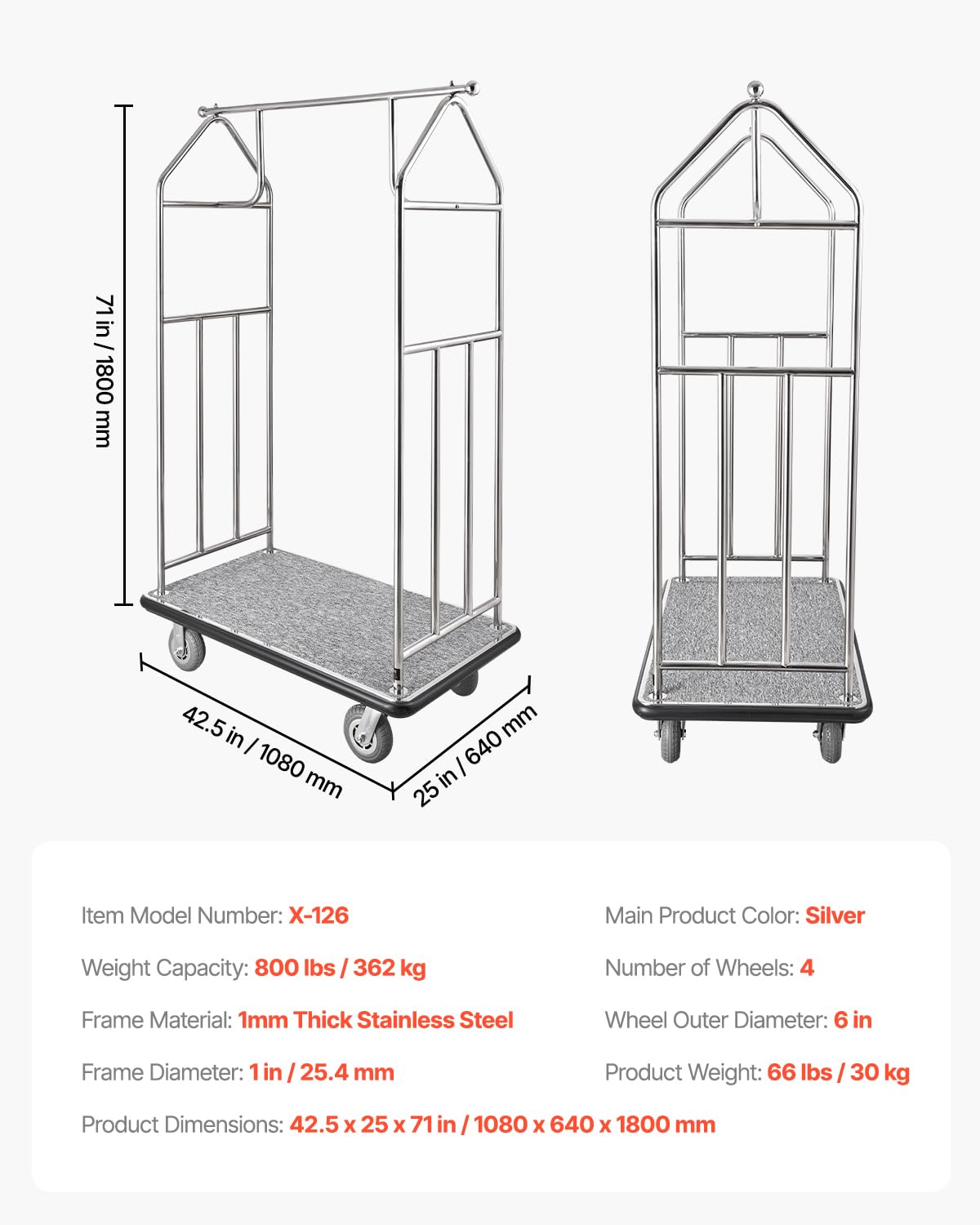 Heavy-Duty Capacity: This luggage cart is built for efficiency with a solid 800lbs capacity! Measuring 42.5 x 25 x 71 inches, it's ideal for hotels and resorts to quickly transport luggage. With a spacious base and stainless steel hanging rods, handling multiple pieces of luggage is a breeze.