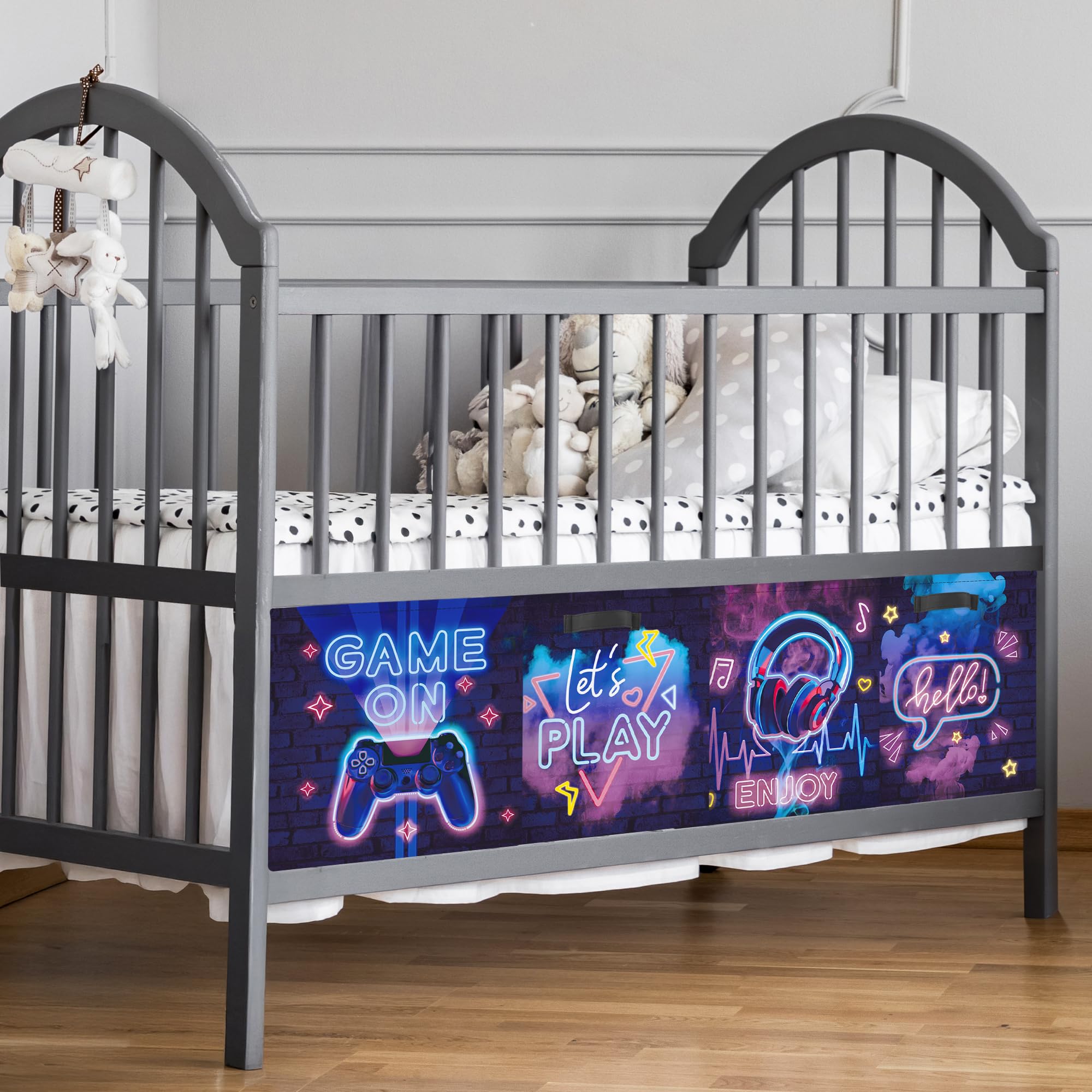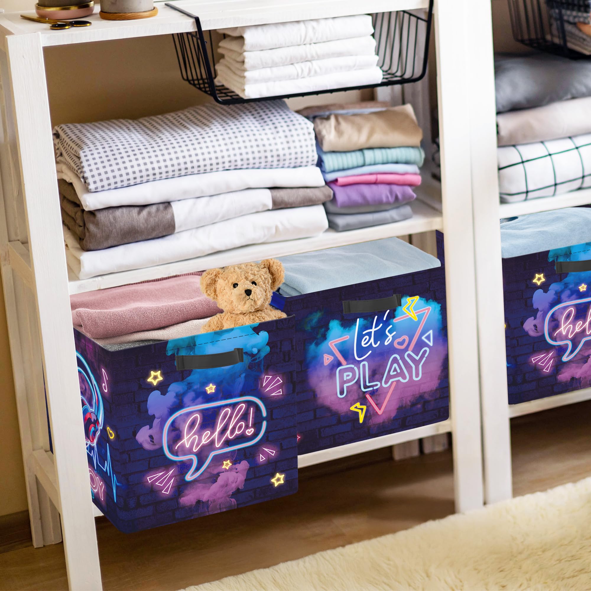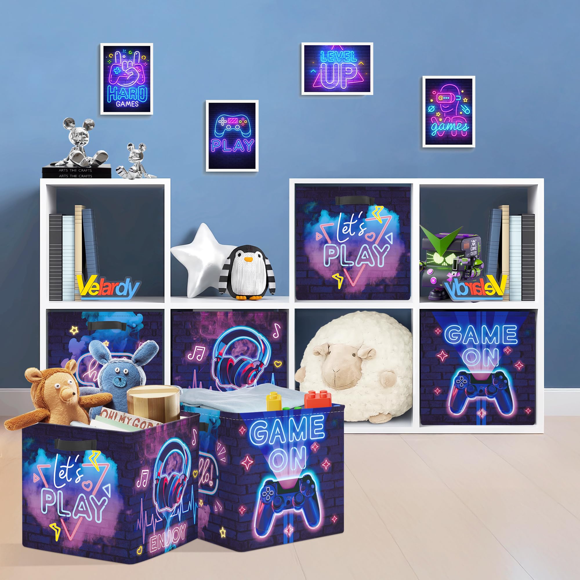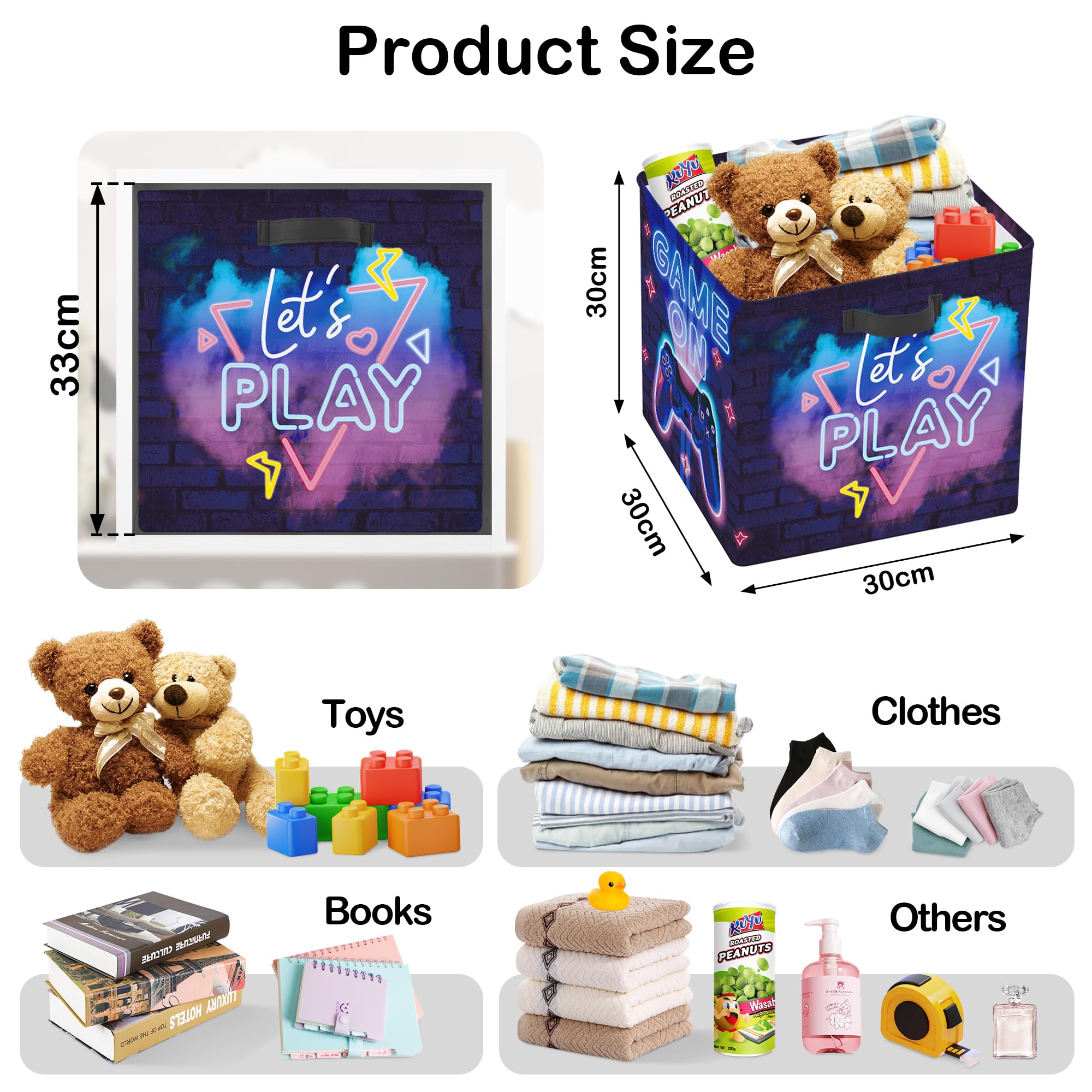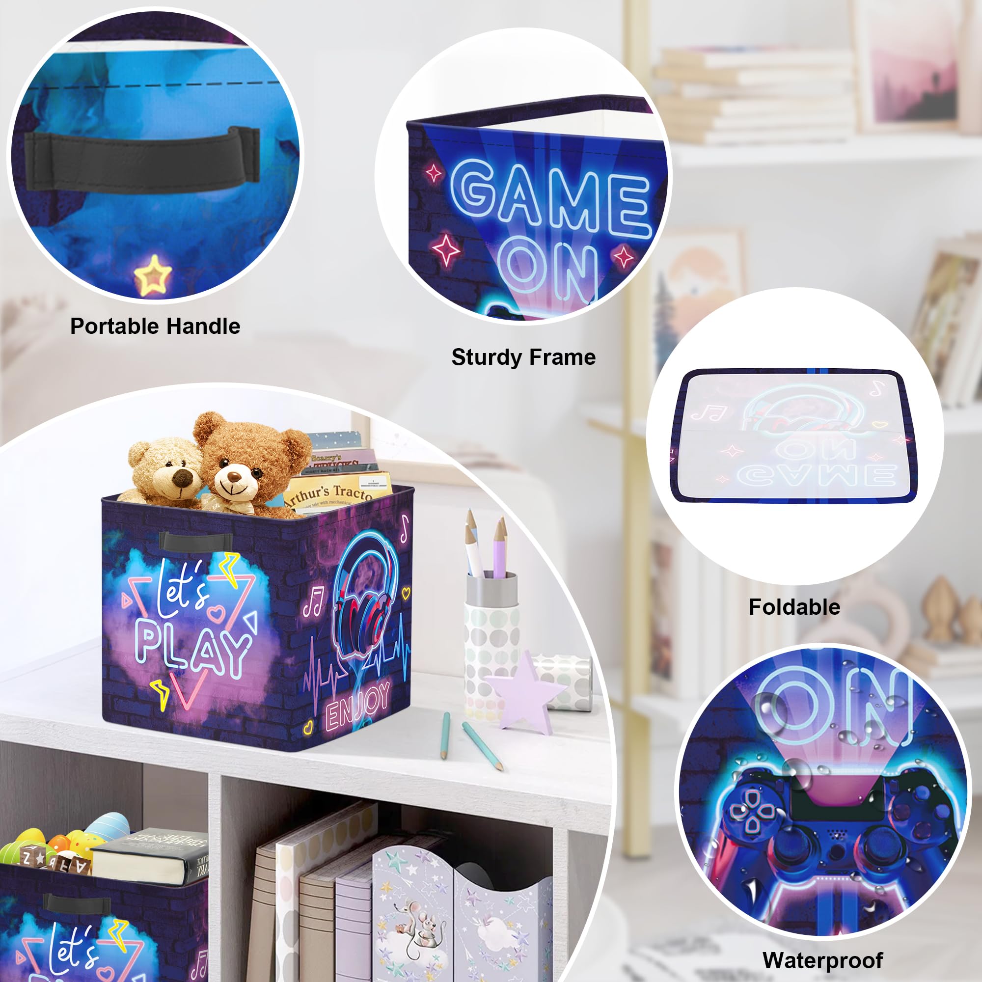Video Game Storage Organizer: Printed with game element patterns and text in neon-style, such as gamepad, headset, etc. The design is unique and suitable for storing or displaying game related items