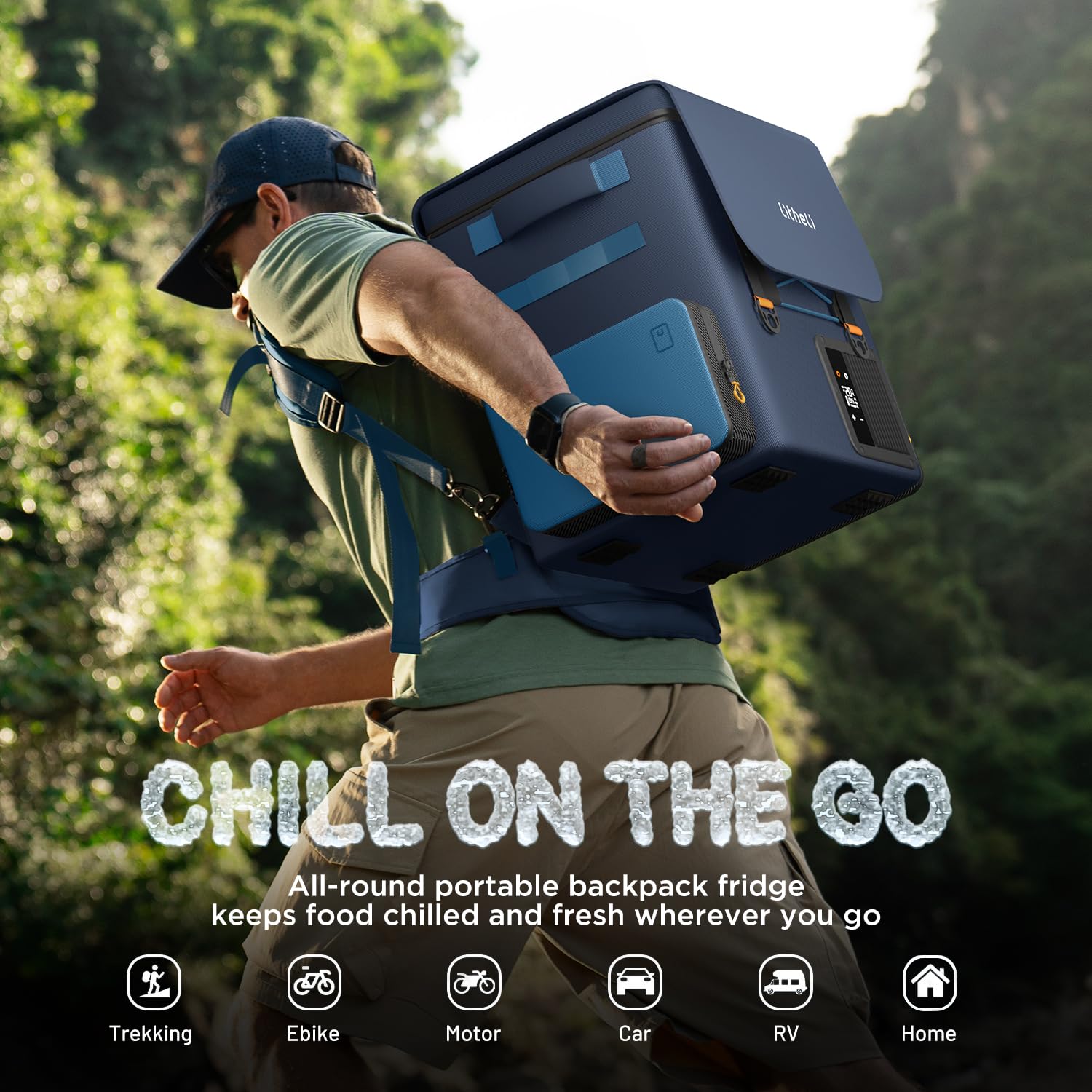 [Portable Power System & Multi-Scene Use] Innovative backpack car fridge design with ergonomic straps (max load 50lbs) - carry on hikes or mount on e-bikes/RVs. Powered by replaceable U20 batteries or direct on-board charging, supports charging of battery packs when powered by AC or DC. Dual-function as power bank: Charge phones/laptops via USB-C port.