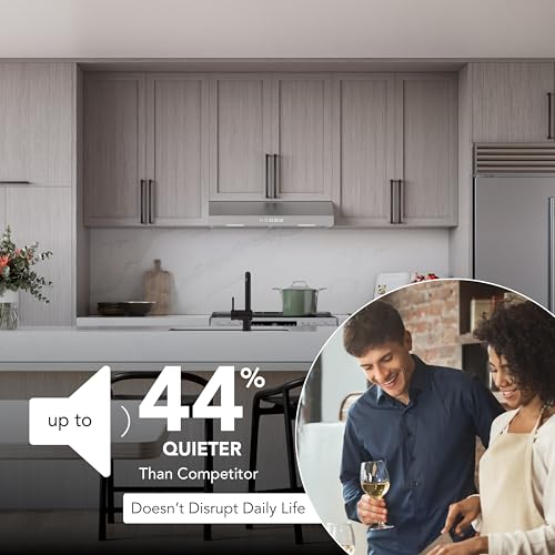 UP TO 44% QUIETER: With sound equivalent to a refrigerator running, this vent hood is up to 44% quieter than competition at 1.5 sones on working speed. Easy-to-clean, fully enclosed bottom with 2 dishwasher-safe high efficiency micro filters
