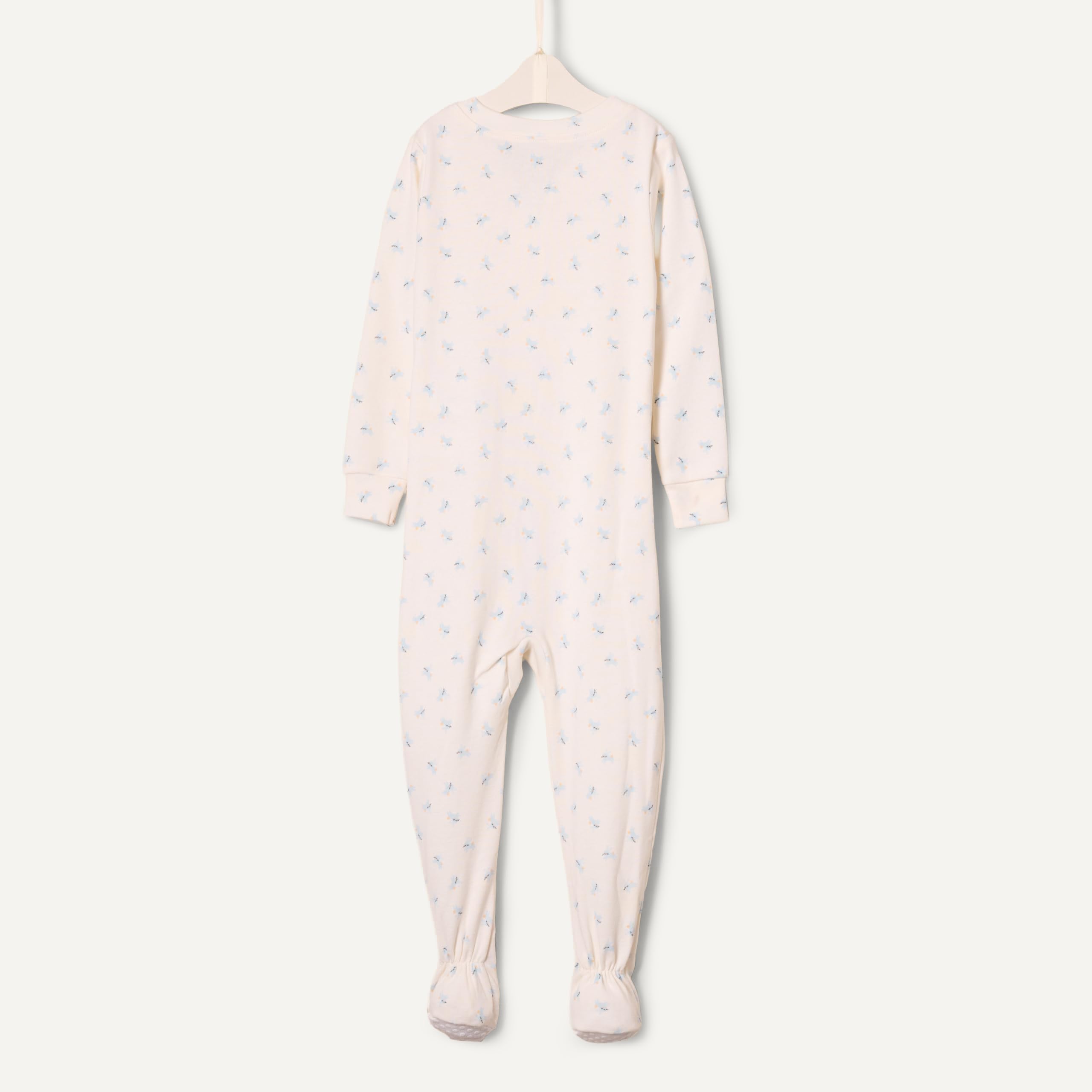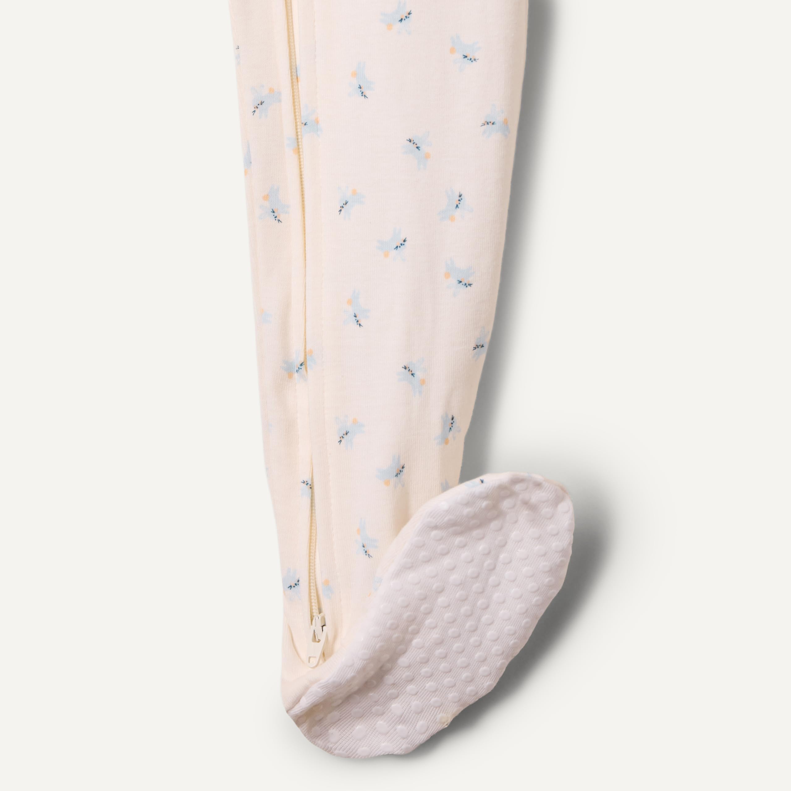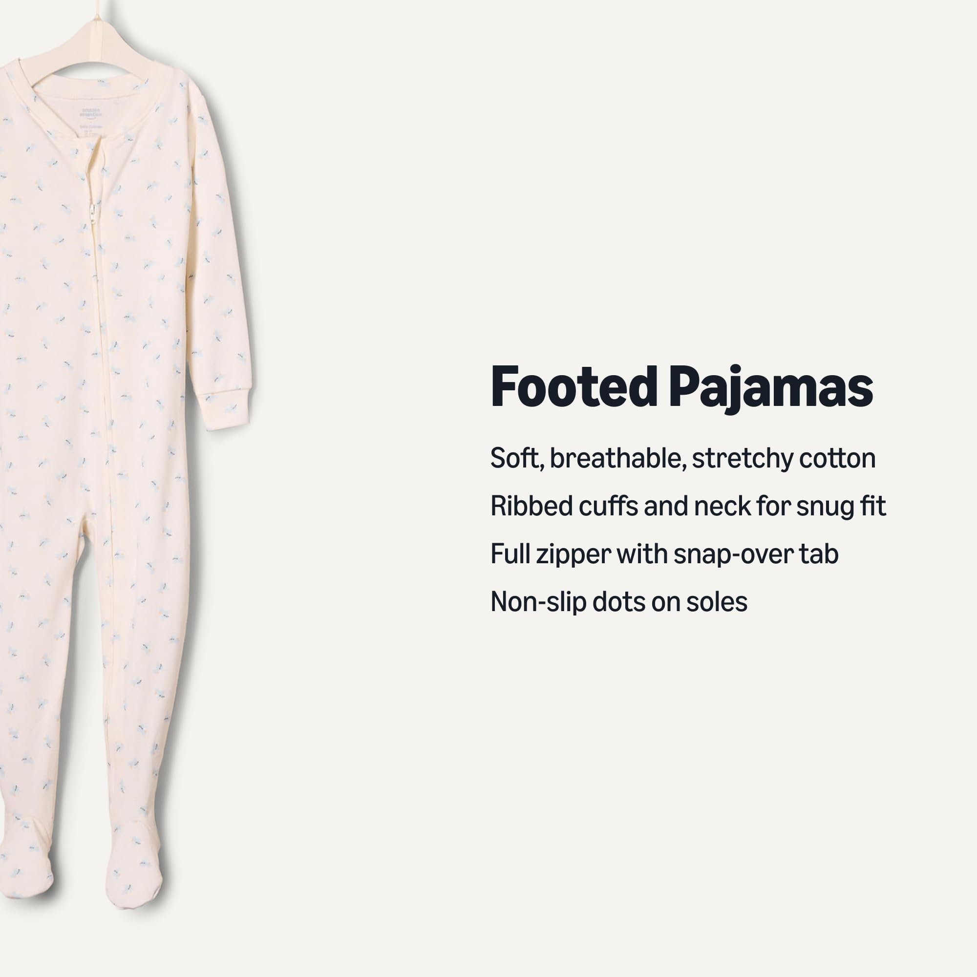 DETAILS: Ribbed cuffs and neck, full ankle-to-chin one-way zipper and attached feet with anti-slip dots on the sole. Designed to be a full-length inseam
