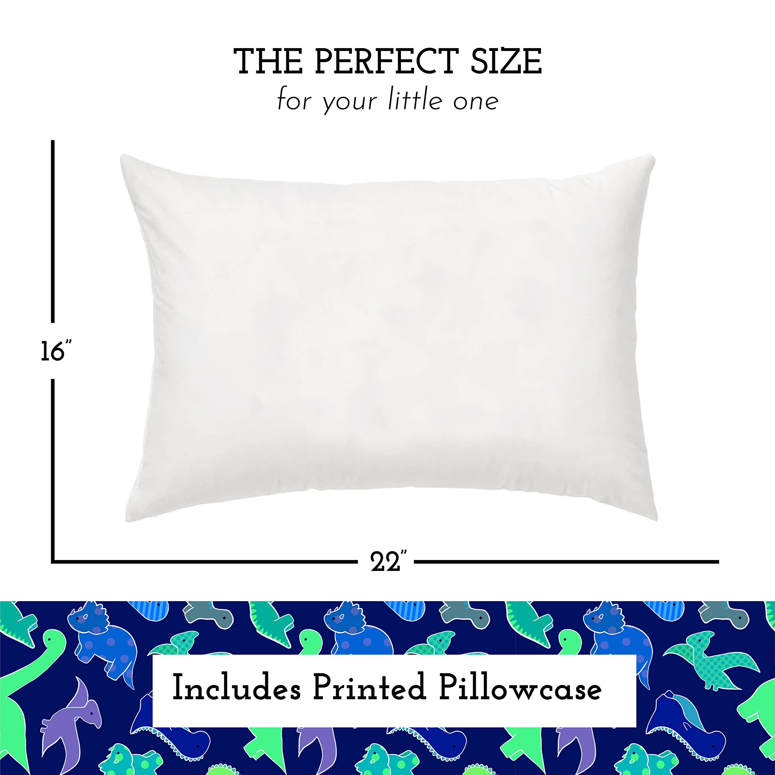 Youth Pillow with Pillowcase 16x22: This is the perfect pillow for your not-so-little kid! In between our toddler pillow and a standard pillow, our 16" X 22" youth pillow is the best pillow for children 4+, or toddlers that need something a bit larger! Comes in colorful designs that appeal to kids.