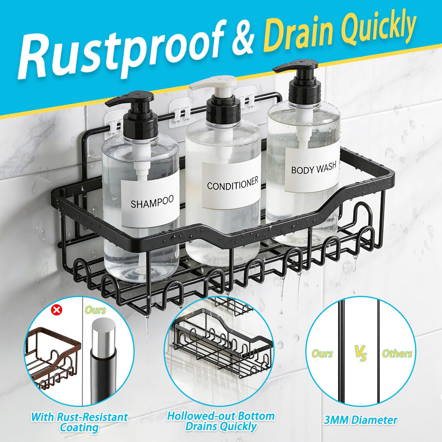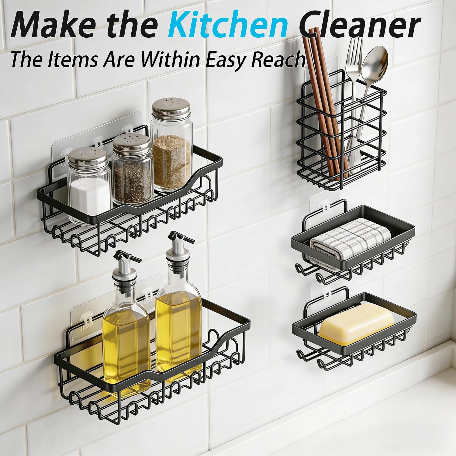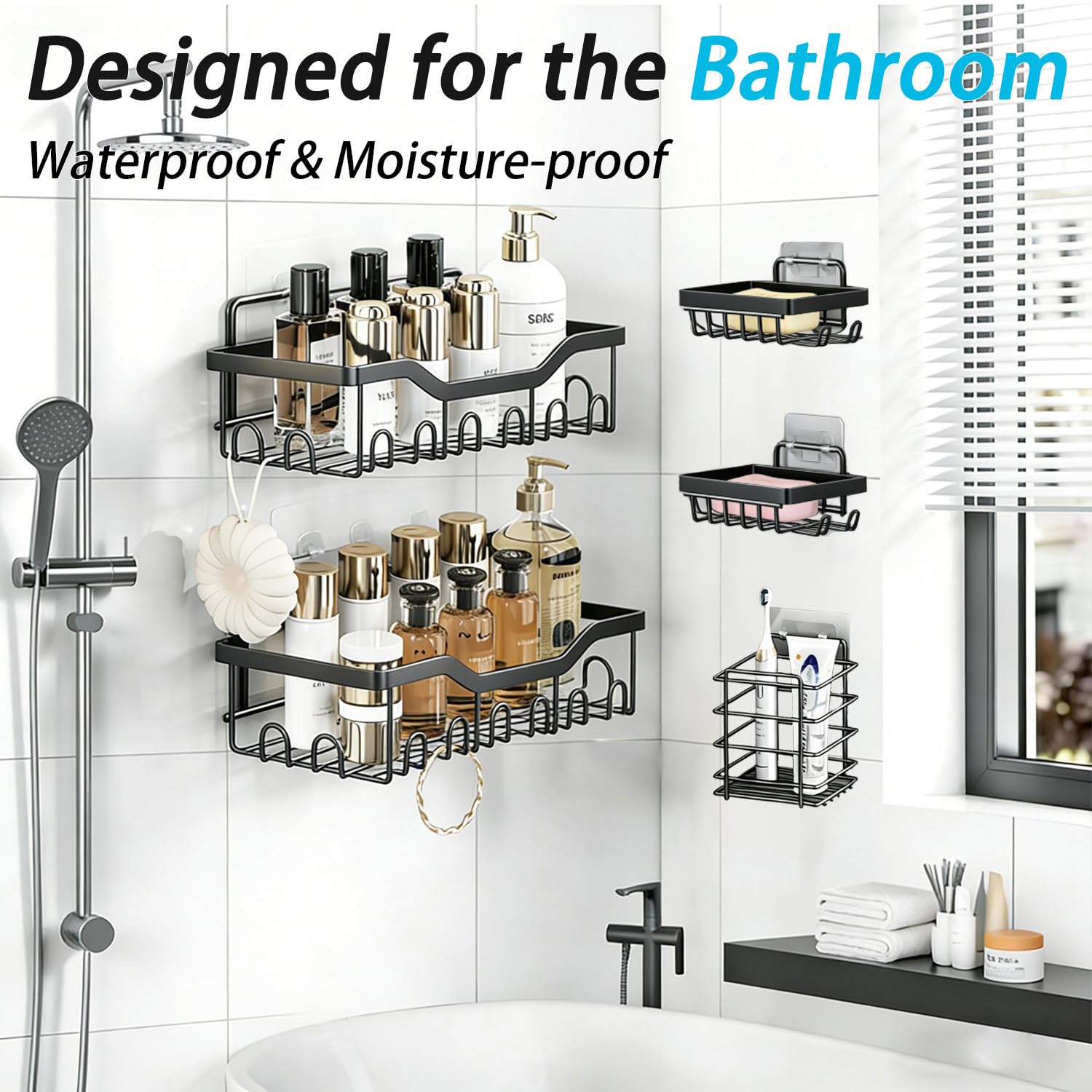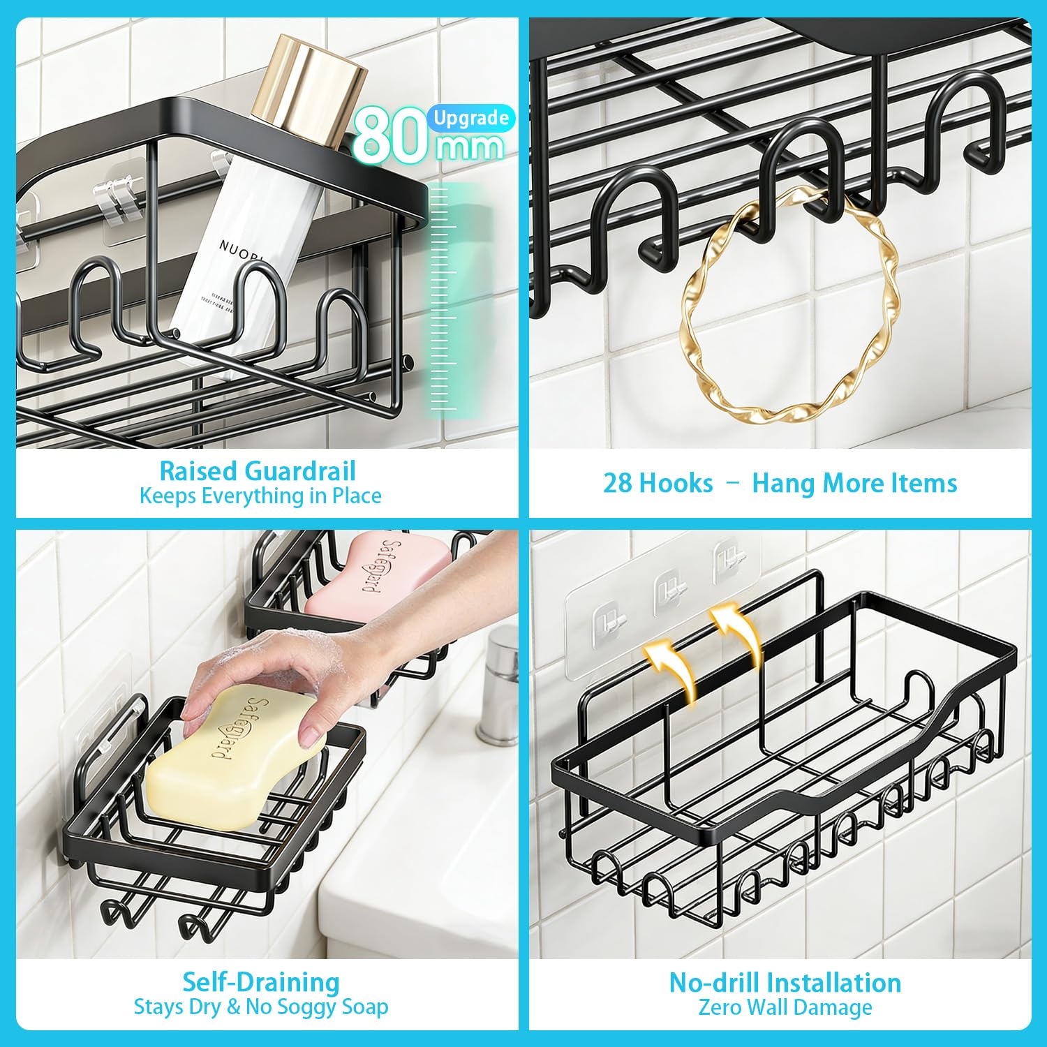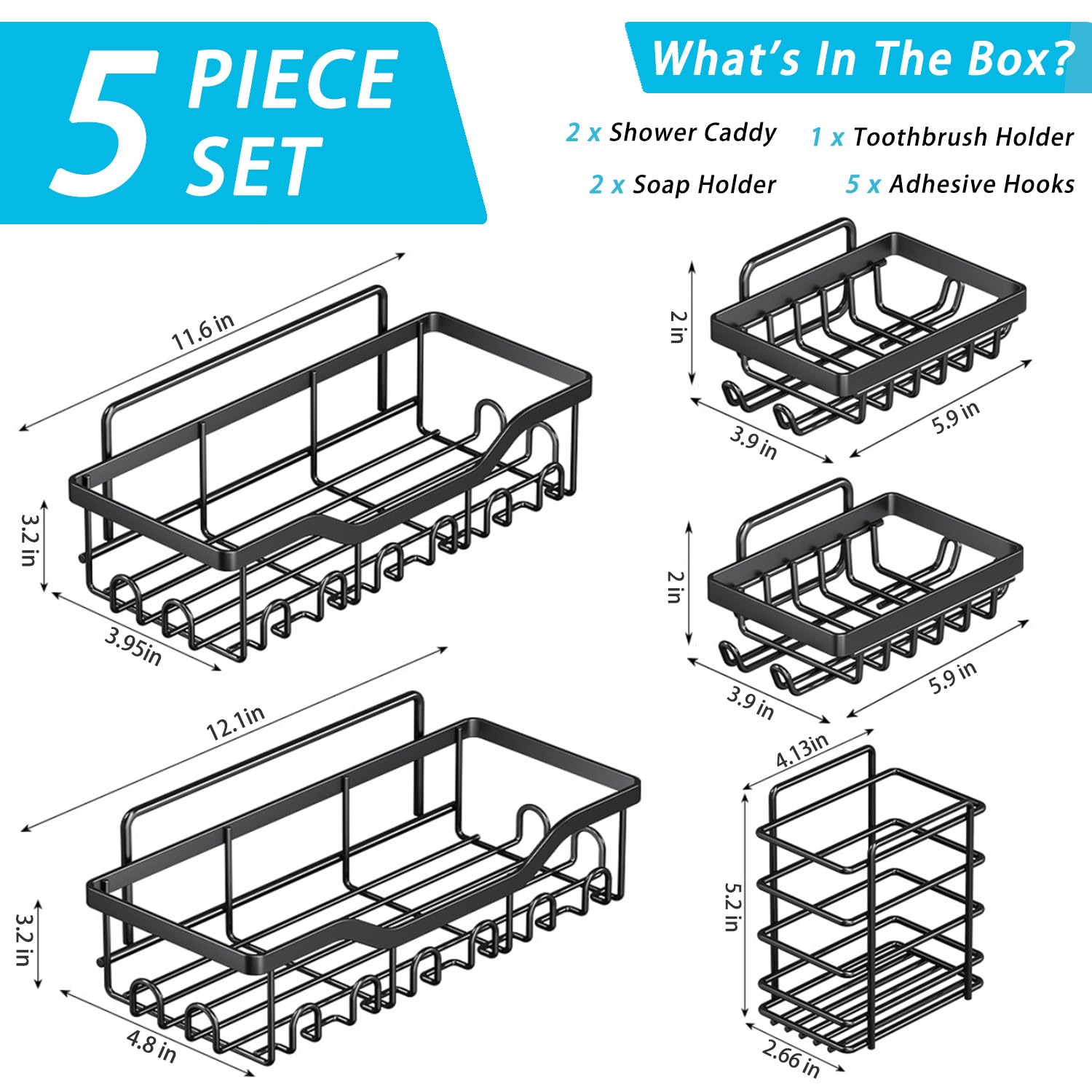 đŚă5-Piece Hanging Shower Organizer SetăIncludes 2 shower caddies, 2 soap holders, 1 toothbrush holder, and 5 heavy-duty adhesives to maximize bathroom storage and organization. Ideal for keeping your bathroom, kitchen, dorm, or utility room tidy and clutter-free.