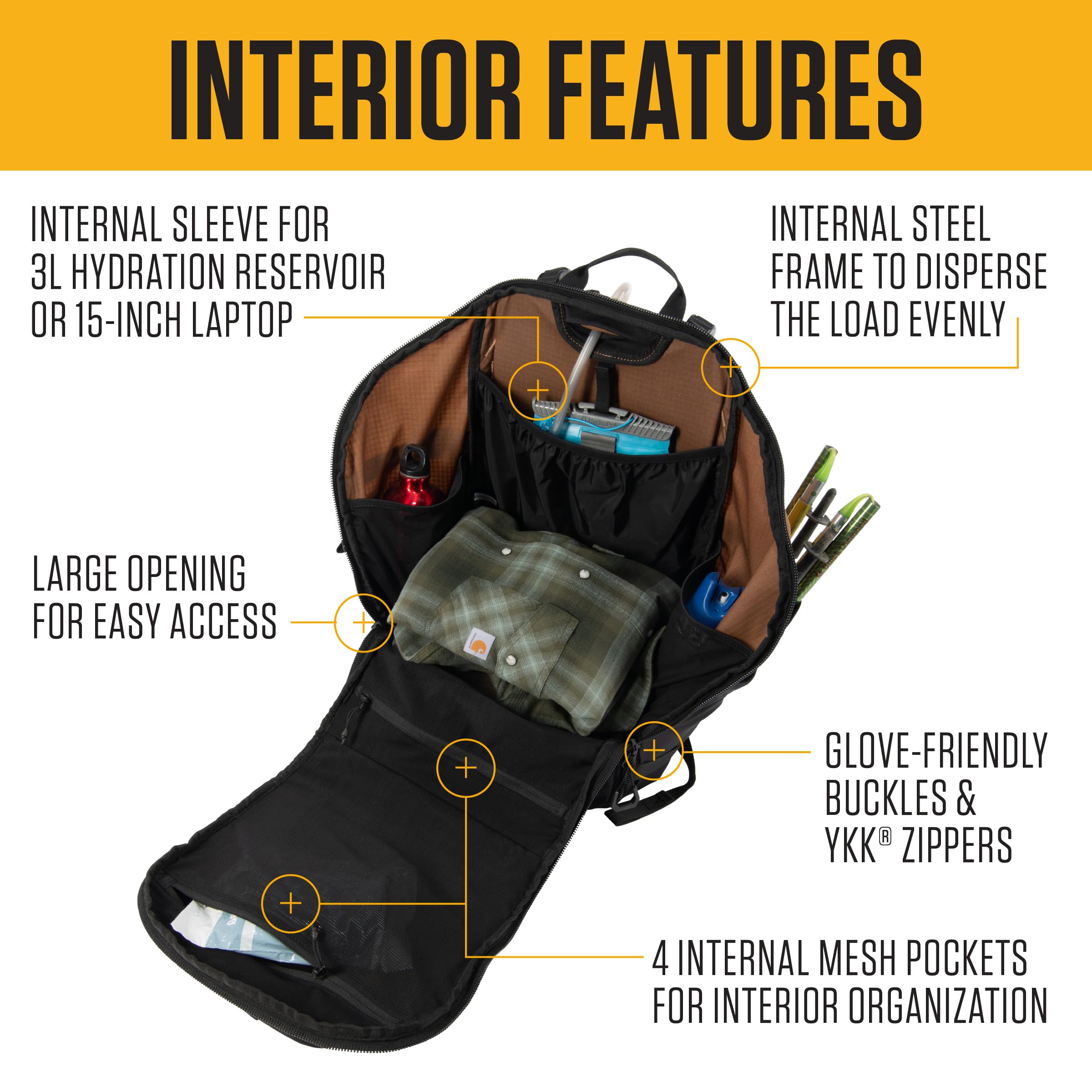 BUILT FOR ANY ADVENTURE| Whether you're on a short, technical outing or a long, rugged hike, this Carhartt 45L internal frame backpack is up to the challenge.