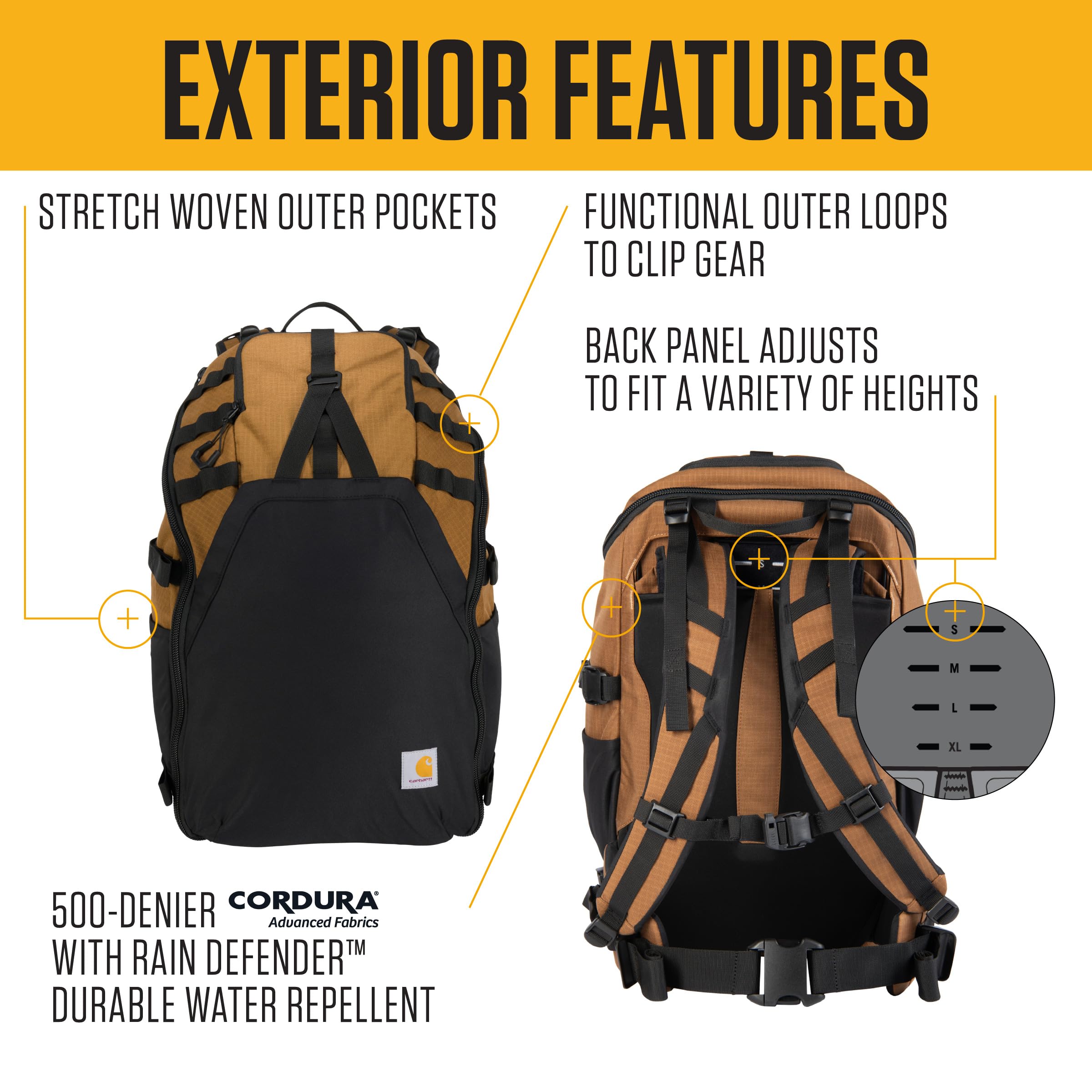 Description The Carhartt 45L Nylon Internal Frame Hiking Backpack is built to handle everything from short technical outings to long, rugged backpacking adventures. Crafted with durable Cordura® double ripstop fabric, this water-repellent backpack is designed to withstand tough conditions while keeping your gear dry and secure. Whether you're hiking, camping, or using it as a travel backpack, its internal wire frame and compression straps ensure weight is evenly distributed for maximum comfort. The versatile design features an internal sleeve that holds a 3L hydration reservoir or a 15" laptop, along with a convenient hanging loop and hydration port for easy access. The adjustable back panel fits a wide range of heights, making it perfect for both men and women. Ideal for outdoor enthusiasts, this reliable and rugged camping backpack for men is ready to take on any adventure—be it hiking, backpacking, or exploring the urban jungle. Make the Carhartt 45L your go-to pack for any journey.