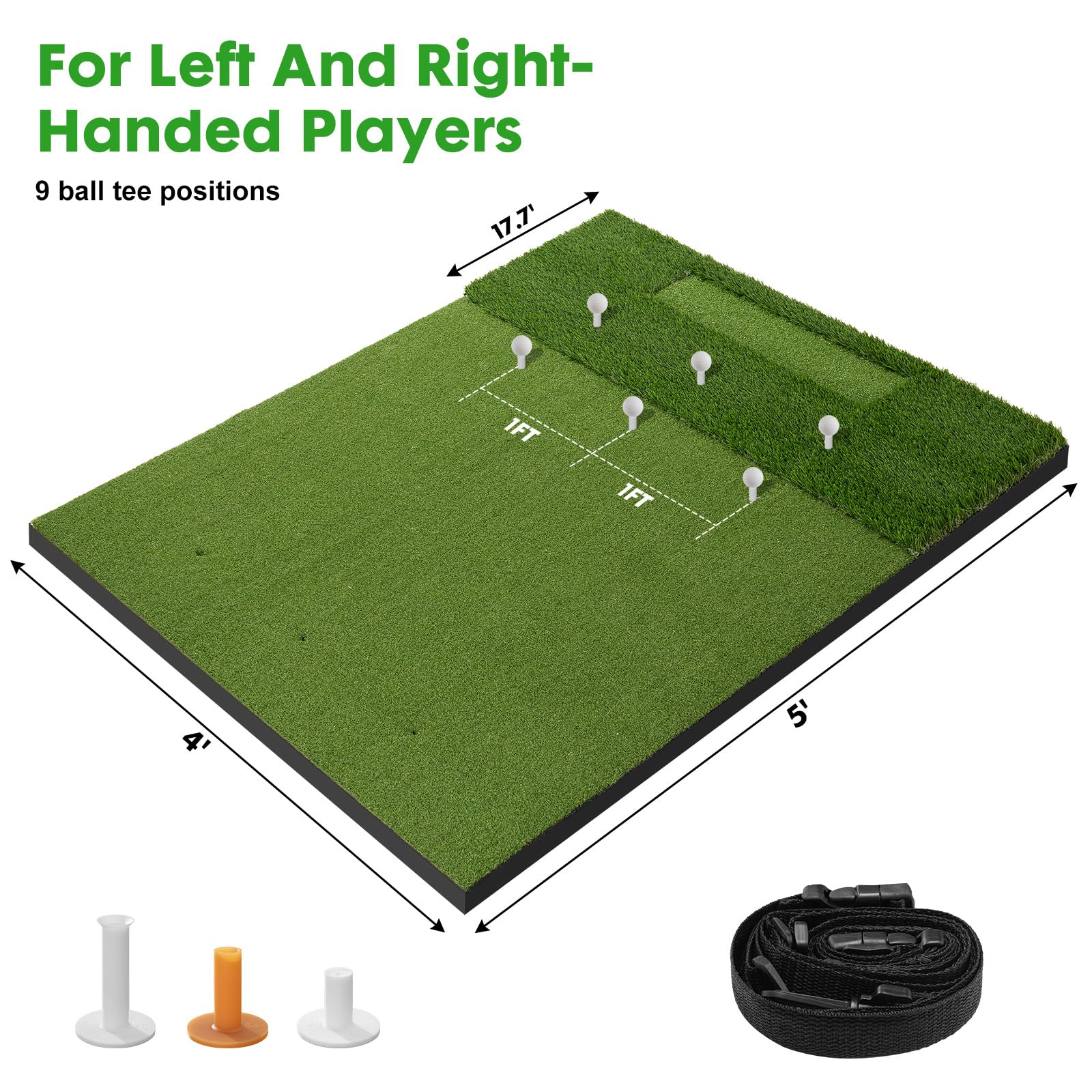 PREMIUM GOLF SIMULATORS FOR HOME: Our 5x4ft golf mat is large enough to provide spacious hitting area for full stance adjustments to provide maximum forgiveness for mis-hits. The 9 tee positions are designed for left/right-handed golfers, driving, chipping, and full swings. Great for all ages - From Beginner to Advanced