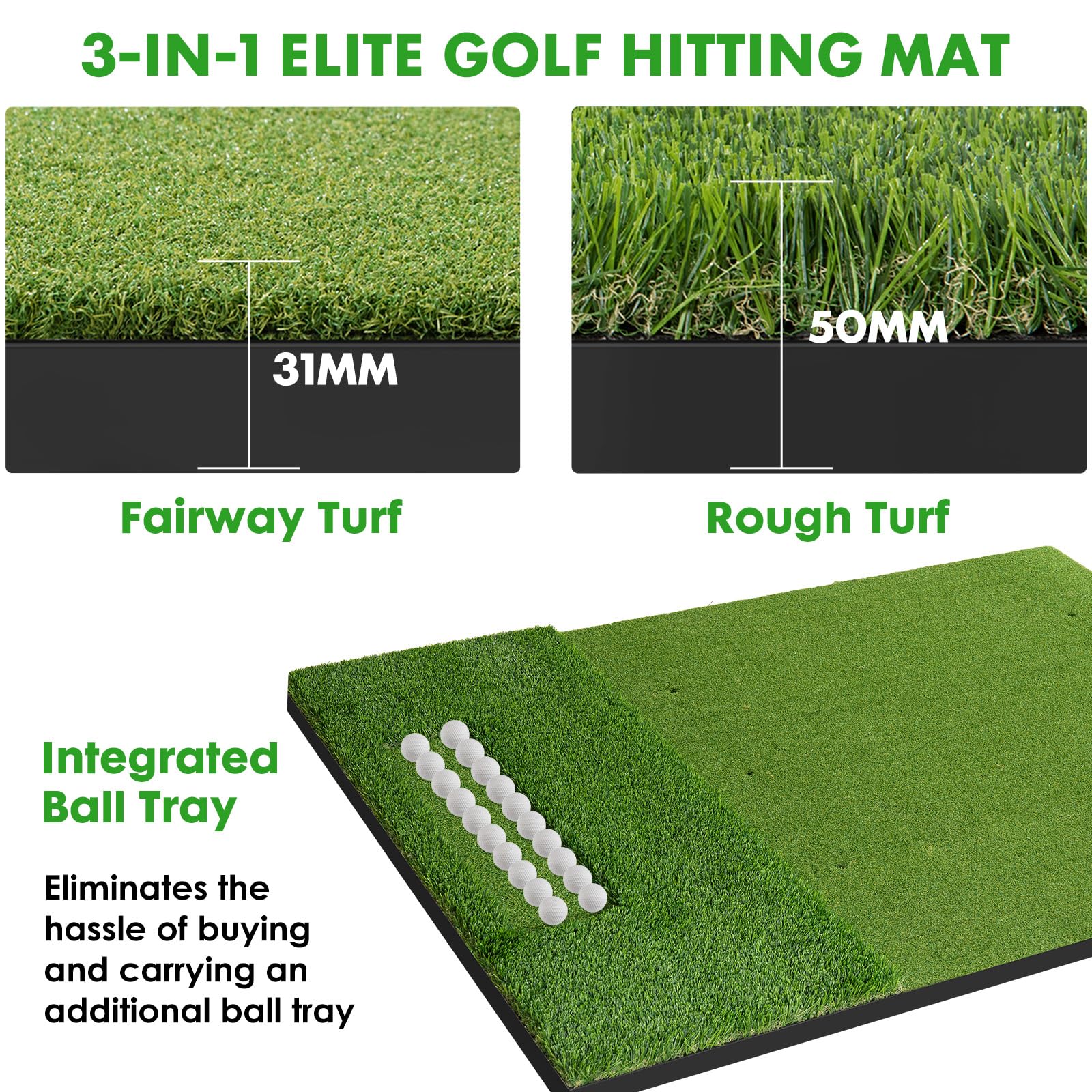 UPGRADE 3-IN-1 DESIGN: RELILAC upgraded dual-turf golf mat mimics authentic rough/fairway terrain for refining swing mechanics and chipping skills. And we integrated a ball tray in longer grass that can store up to 40 balls, ensures golf balls organized and at hand for more efficient practice