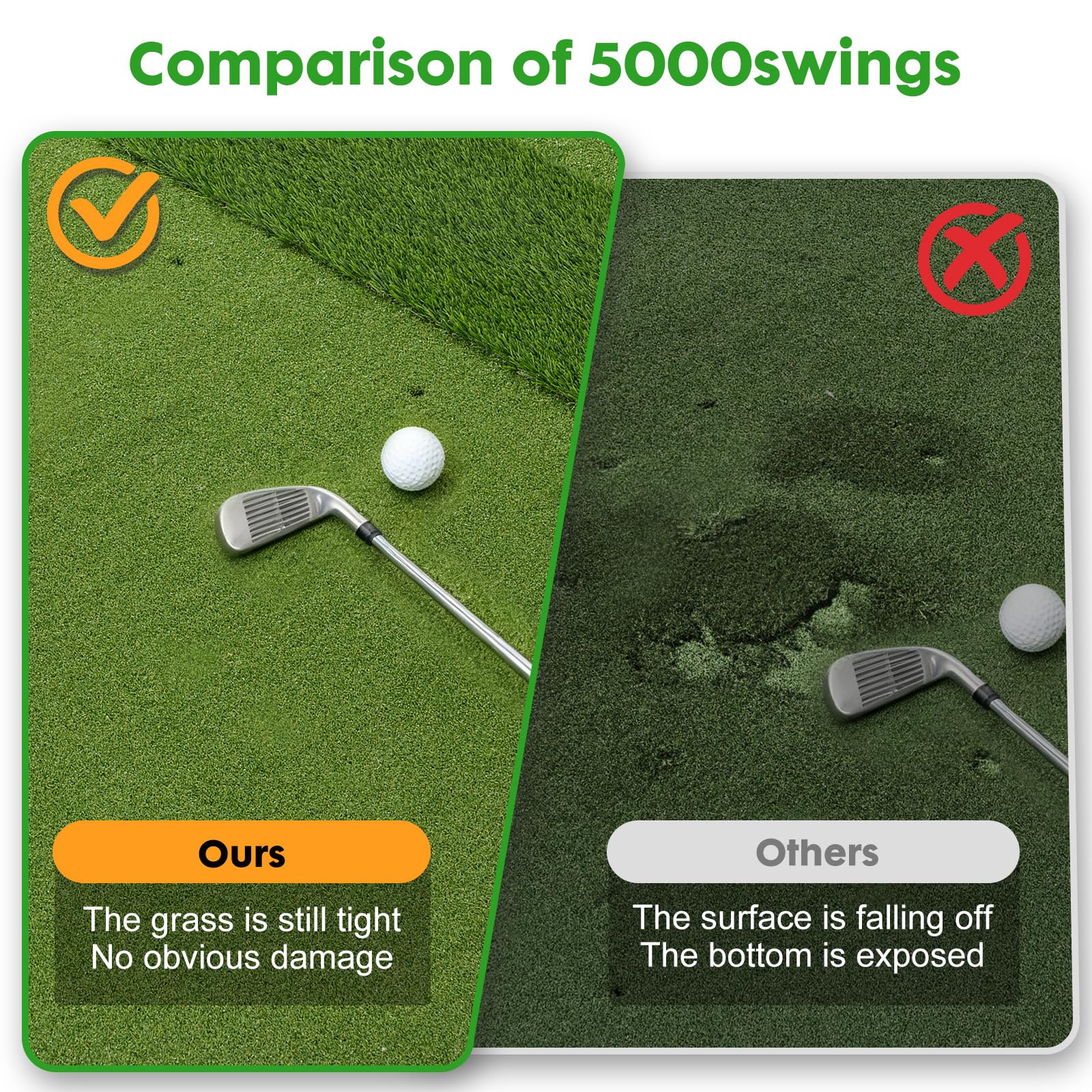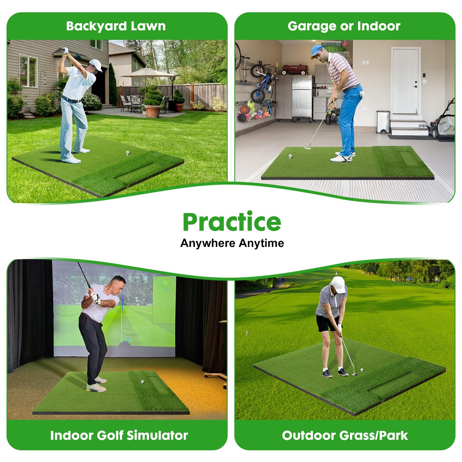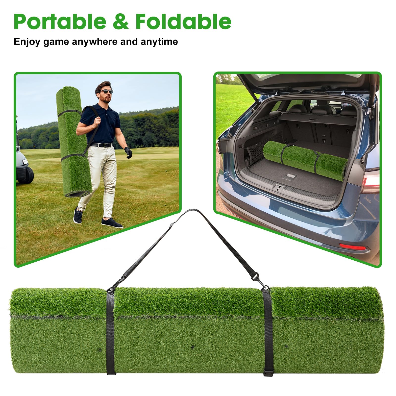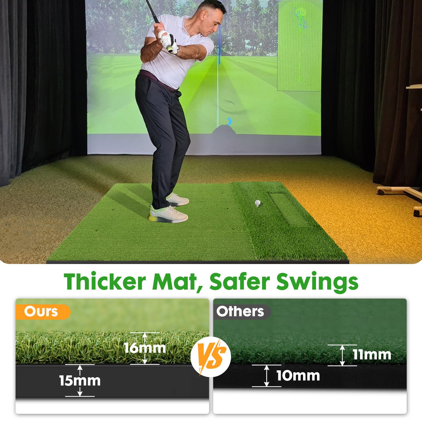 HIGH-TENACITY TURF: Engineered with 16mm & 35mm high-density artificial grass, our golf simulator mat is robust enough to endure powerful swings while maintaining excellent condition even after extended use. It keeps your clubs clean and residue-free, ensuring long-lasting durability and reliable performance for countless rounds of play