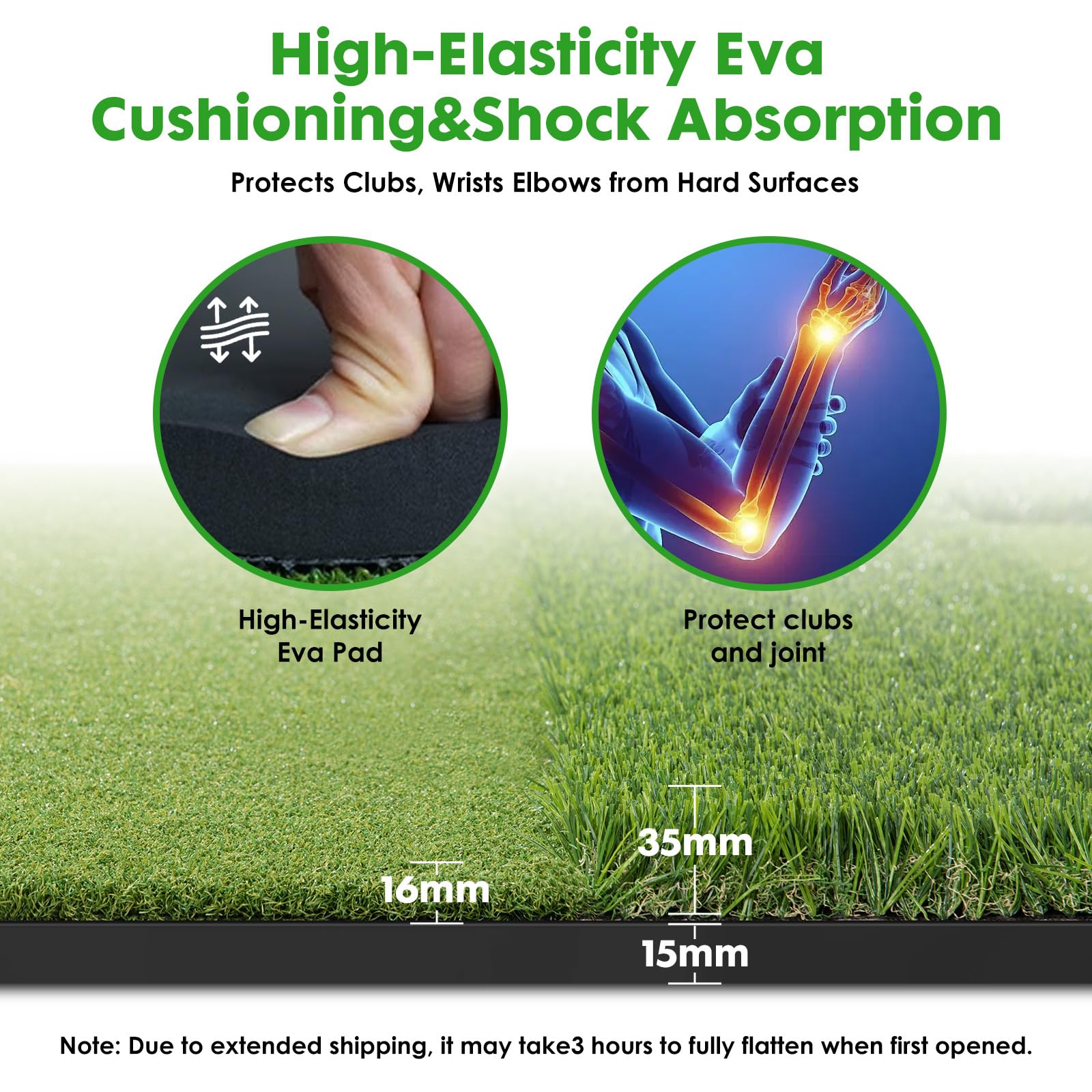 COMFORTABLE AND SAFE: Our golf practice mats feature a robust 15mm high elasticity EVA rubber non-slip base, providing maximum stability on any surface, indoors or outdoors, and protecting your joints and muscles