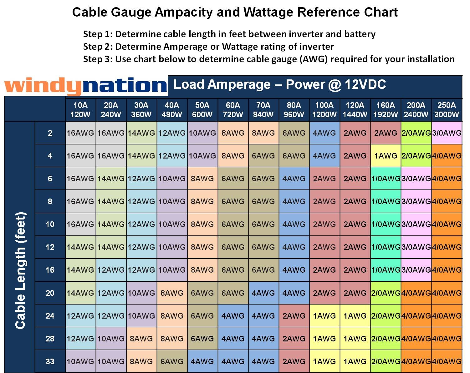 Refer to Image 2 in the photo gallery for a chart that will help you select the correct inverter cable gauge and length depending on the amperage of your inverter.