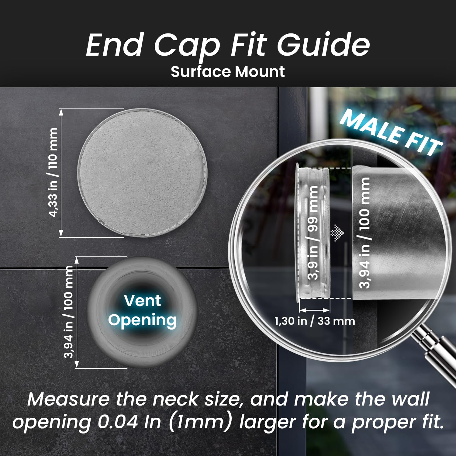 SIZE & COMPATIBILITY – NECK DIAMETER: 3.90". NECK DEPTH: 1.30". DUCT CAP COVER PLATE DIAMETER: 4.33". Designed for 3.94" round ducts. Works with HVAC ducting, dryer vent duct, and exhaust vent pipe systems both in home improvement and commercial projects.