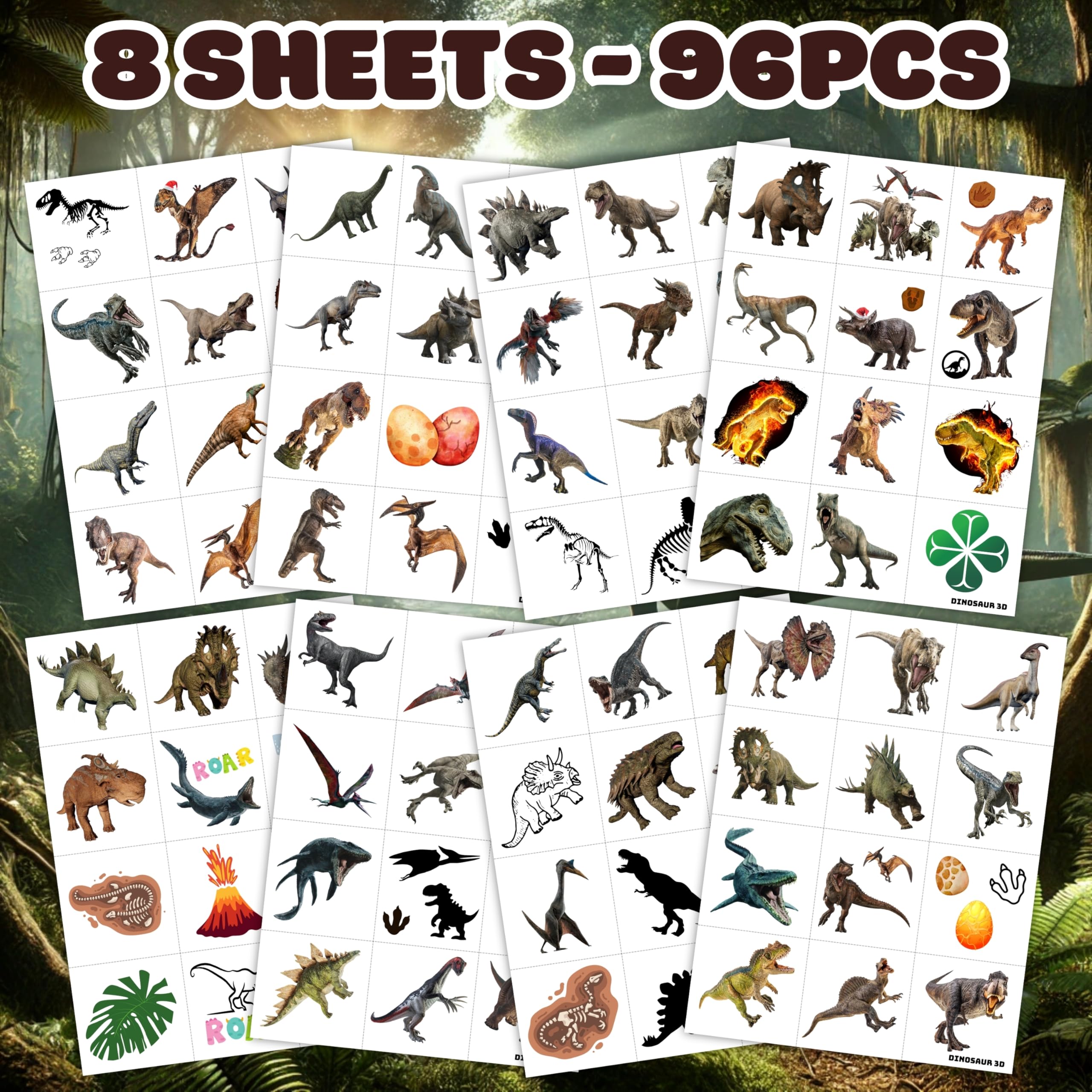 🦖【PERFECT DINOSAUR TEMPORARY TATTOOS】: Our Dinosaur-themed temporary tattoo stickers come with 8 pre-cut sheets, featuring 96 unique and adorable designs. Each sheet measures 6.3 x 4.7 inches, perfectly sized for kids. Thanks to the pre-cut perforated lines, you can easily tear them apart by hand—no scissors needed! These tattoos make fantastic party favors or small holiday gifts.