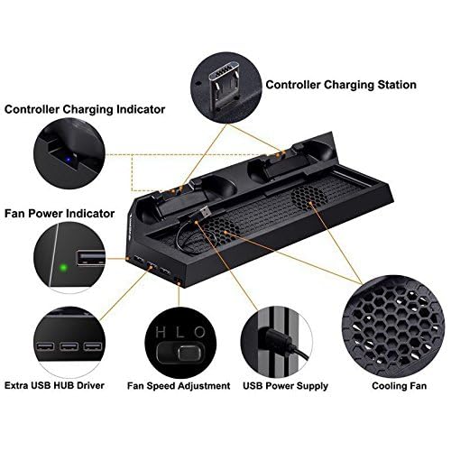 Description: This cooling stand reduces the working temperature of the PS4. It can also be used to charge 2 controllers at the same time which can greatly save your time and be convenient in game play. It features 2 built-in fans to keep your game console cool and calm, no more overheating after long hours of game playing. Features: *Color: black. *Material: ABS. *Size: about 28 x 15 x 4cm. *All-In-One: console vertical stand + cooler + dual shock charging station + USB hub. *Features 2 built-in fans to keep your game console cool and calm, no more overheating after long hours of game playing. *It is space saving that allows game console to be used safely in a vertical position. *Charging station with 2 charger ports to charge both of your game controllers simultaneously. *2 hub and 1 USB ports allows for connecting mouse, keyboard and other USB devices. Not recommended for charging. Compatible with: Sony PS4/PS4 Slim/PS4 Pro Package includes: 1 x vertical stand