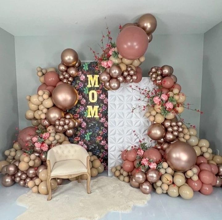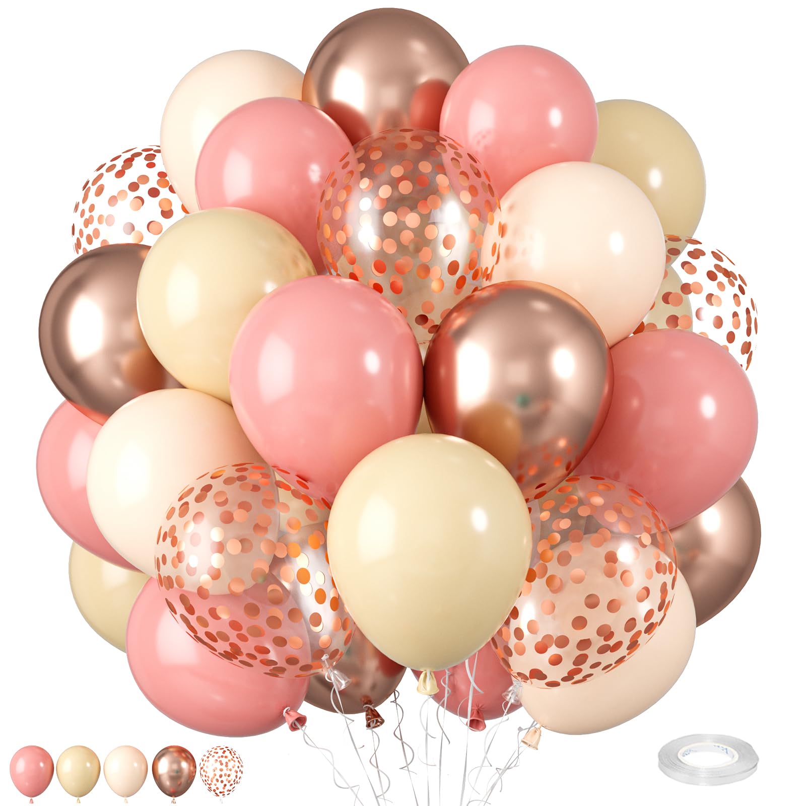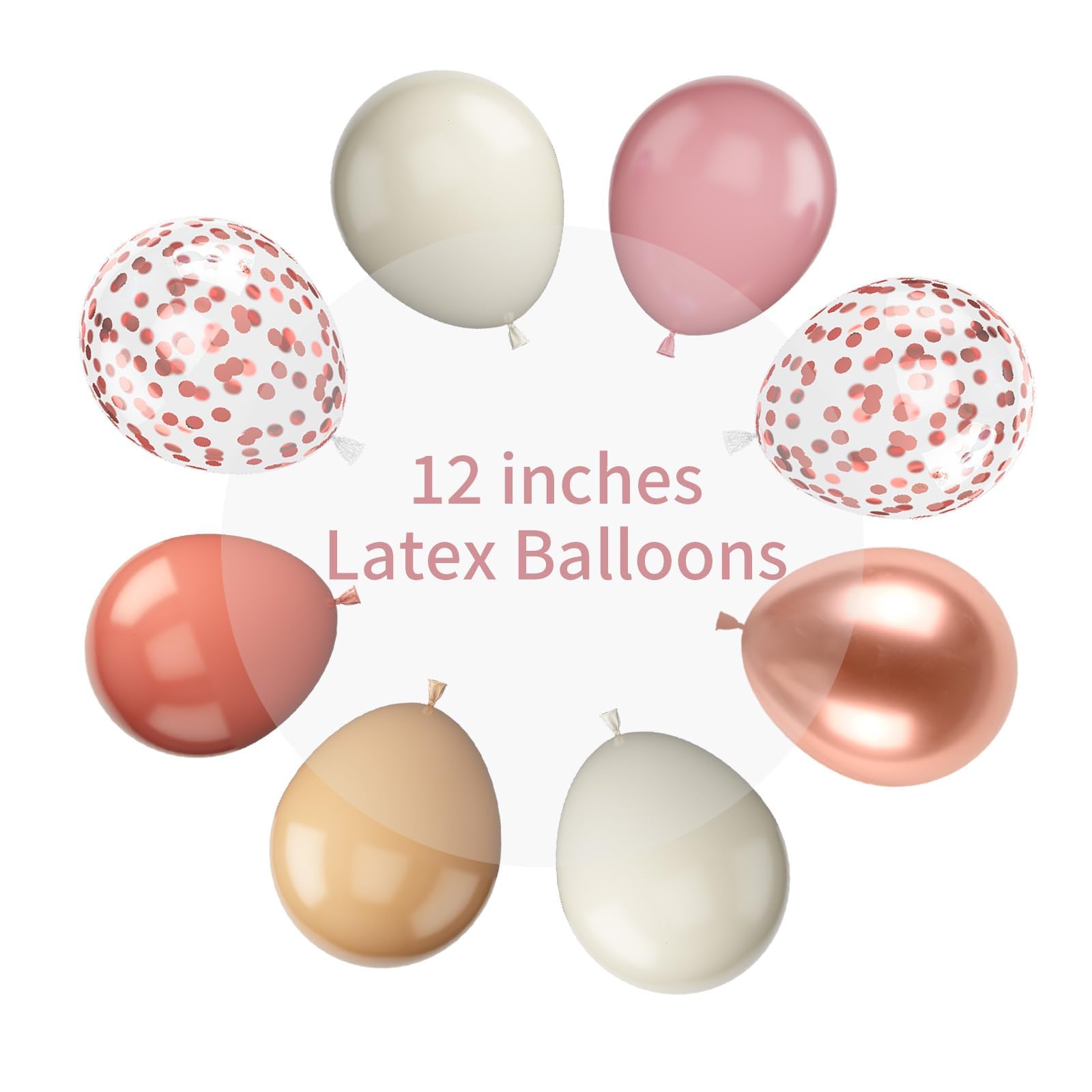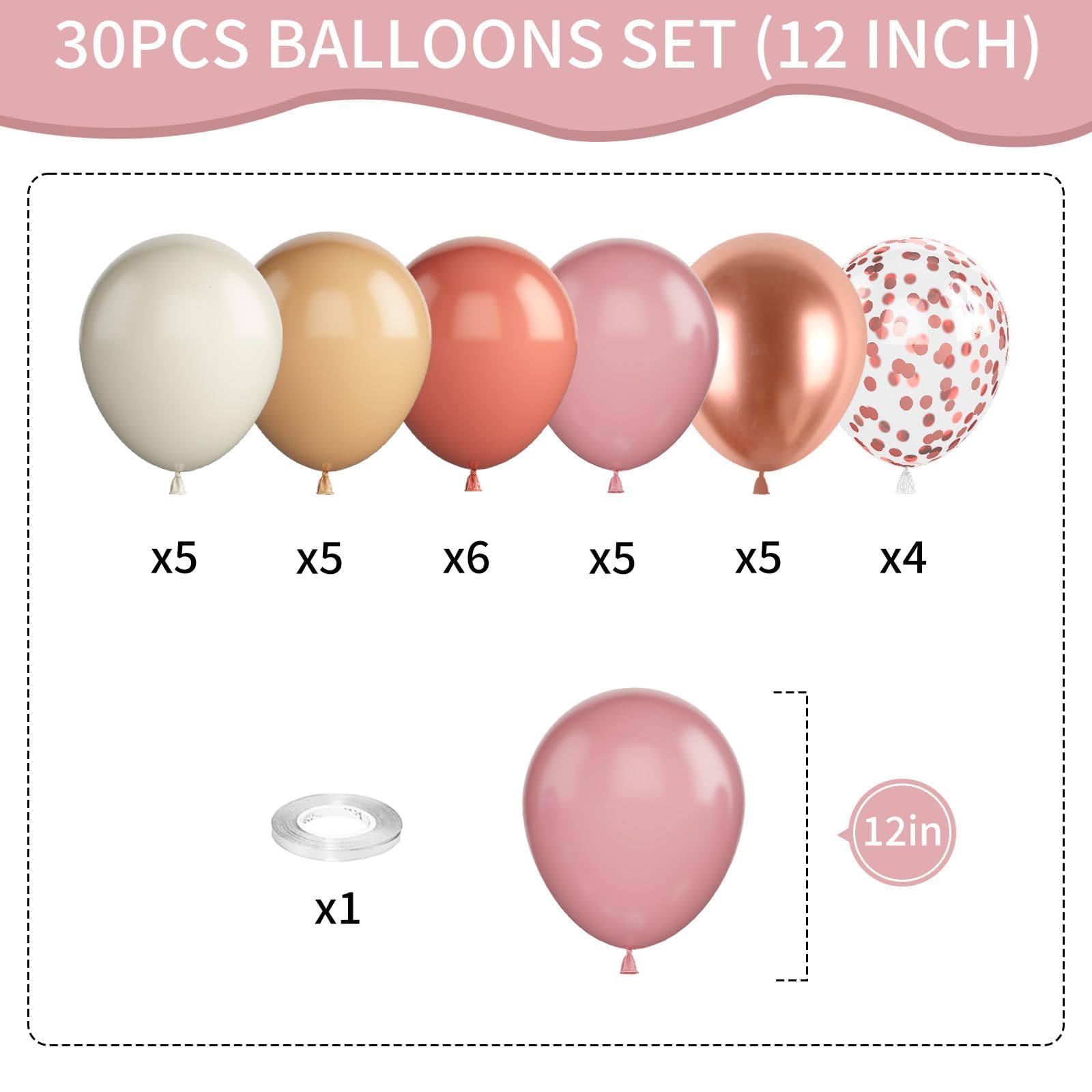 12 Inch dusty pink balloon set: Package content includes 5 pcs metallic rose gold balloons, 4 pcs confetti rose gold Balloons, 11 pcs dusty pink balloons, 5 pcs retro cream balloons,5 pcs beige balloons, a balloon ribbon