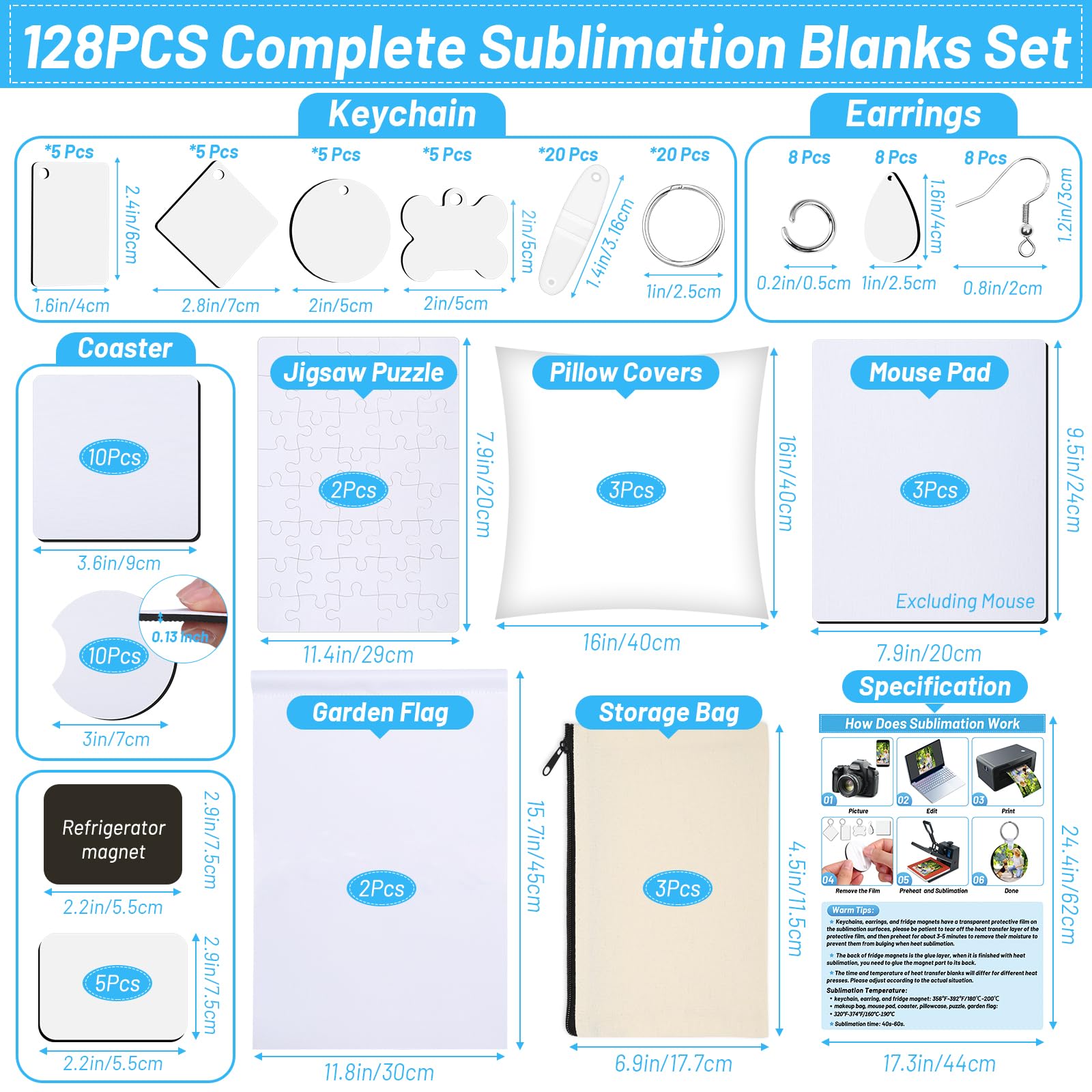 đĽ ă128+ Ready-to-Print Surfaces in 1 Bagă Jumpstart your crafting empire! Massive variety includes: 1 Instruction Manual, 3 makeup bags, 5 fridge magnets, 20 coasters, 20 keychains, 5 magnets, 2 garden flags, 8 earrings(8 ear hooks+8 closure rings), 20 keychains(20 iron rings+20 plastic buckles), 3 pillowcases, 2 puzzles.