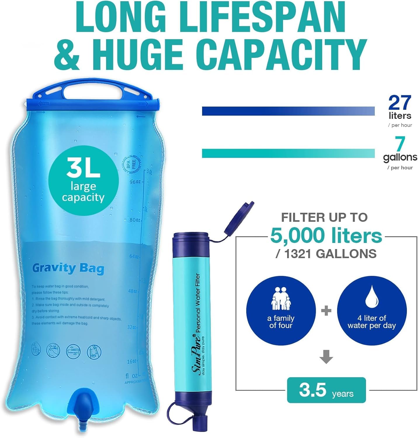 Very Versatile: Besides the gravity water filter system, the included filter can be used in many different ways. Use as a personal water filter, or add a 29.5-inch extension tube for more distance drinking. Even connect onto a water bottle.