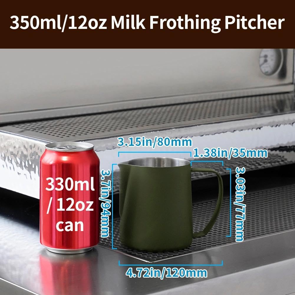 INSIDE SCALE LINES MEASURING: The milk pitcher has clear inside measurement lines(ml/oz), making it easier to control the amount of milk or cream per cup of coffee. 12oz/20oz milk frother pitcher can satisfied your different demands. Ideal for foaming or steaming milk, used in espresso and cappuccinos, it can be used for any liquid measuring like water, juices, batter mixes, smoothies etc.