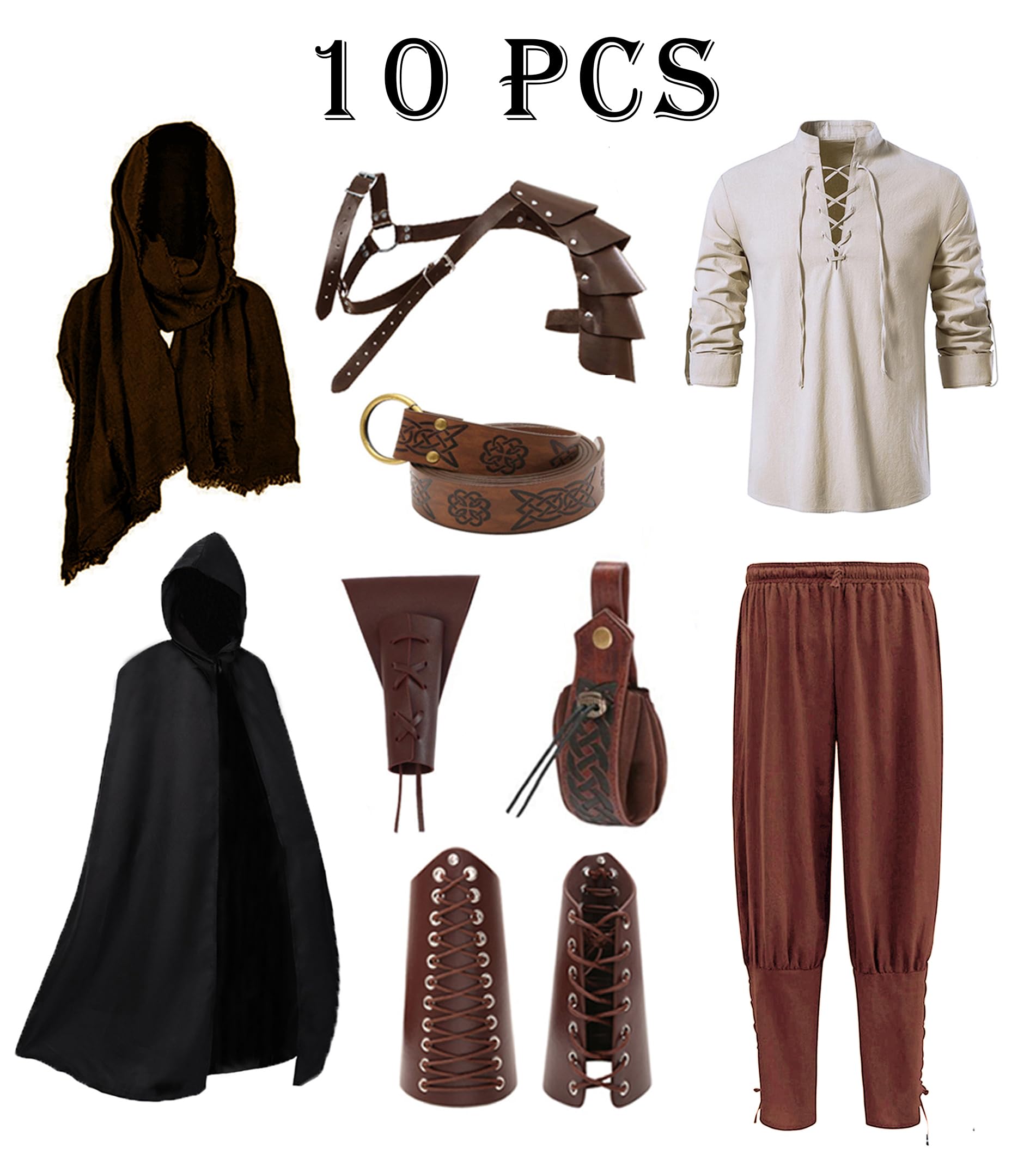 The package include 10 pieces: a pirate shirt, a bare belt trousers, a scarf, a cape, a viking belt, a retro waist bag, 2 buckle wrist guards, a Leather pauldron, a sword holster