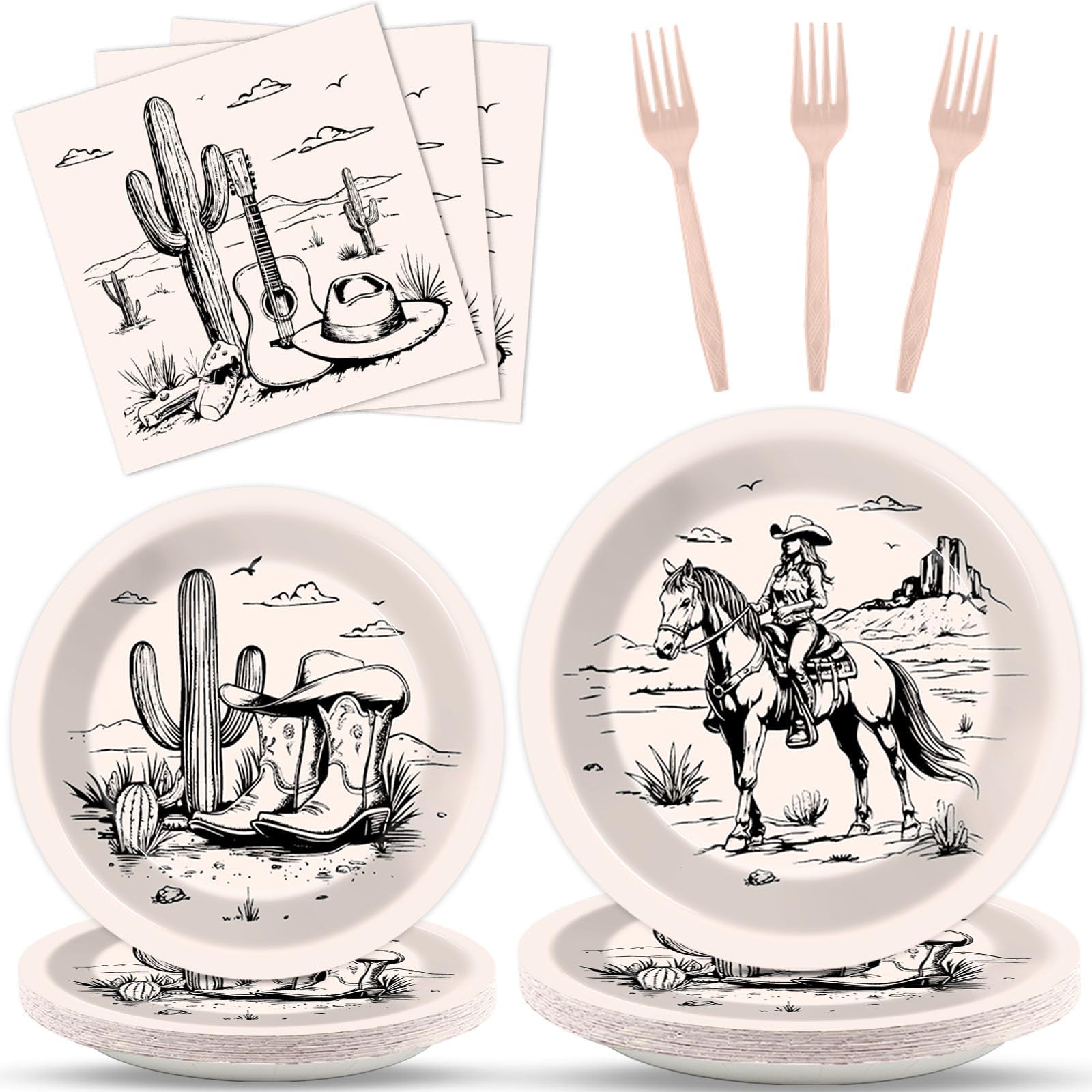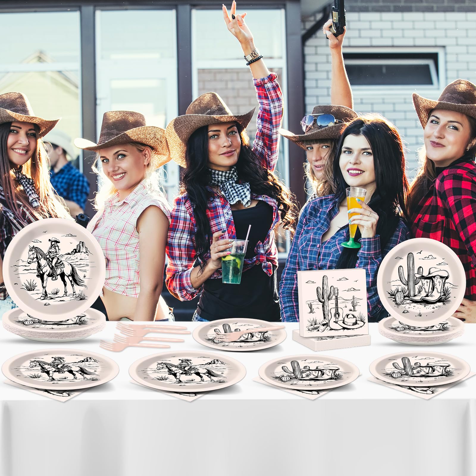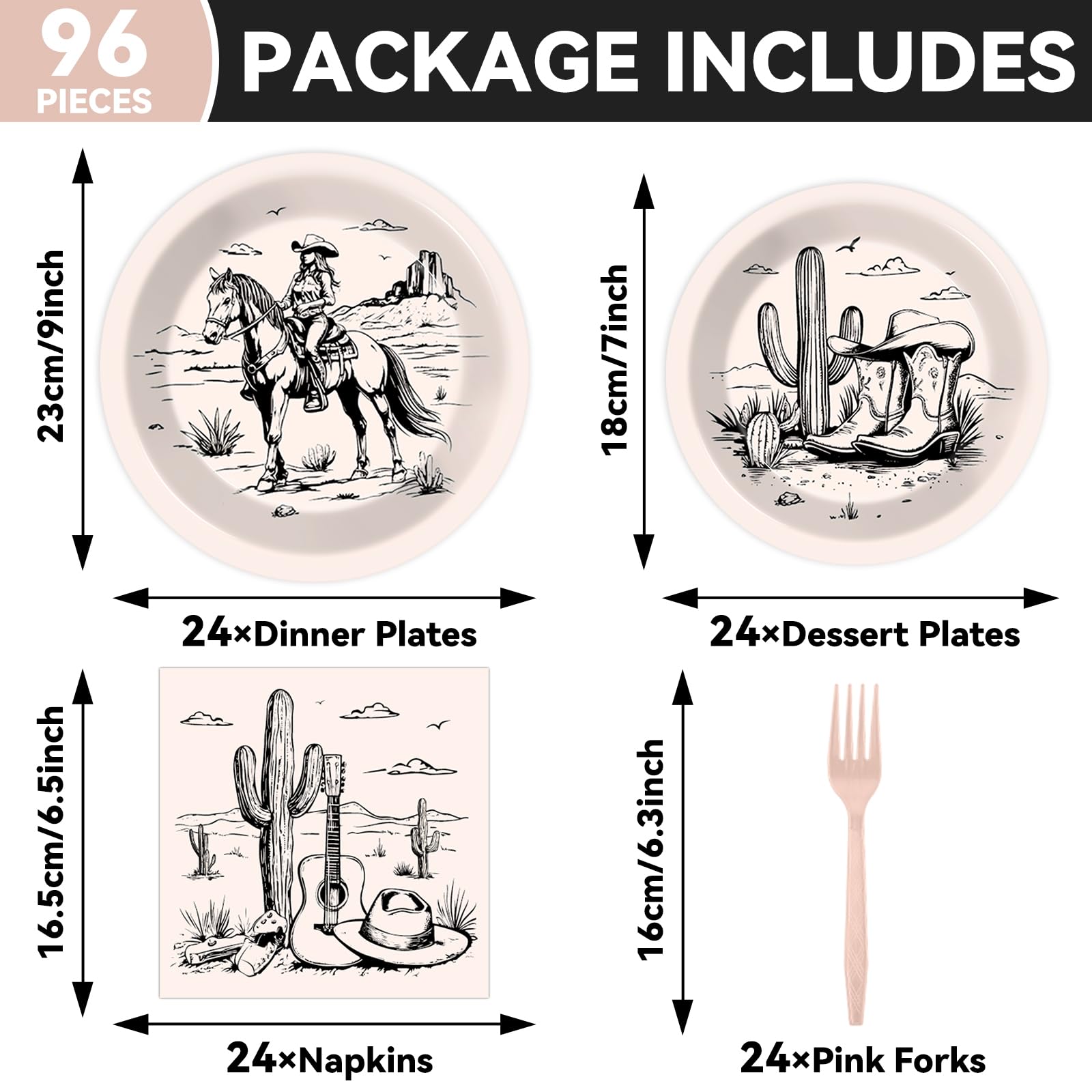 gisgfim 96Pcs Western Party Plates and Napkin Happy Cowgirl Party Supplies Wild West Tableware Dinnerware Set Western Themed Paper Dinner Dessert Plate Party Decoration Favors Serve 24 Specifications: Material: paper Color: Pink Package Includes: 24 x 9inches wild west dinner plates 24 x 7inches wild westdessert plates 24 x 6.5inches wild west napkins ( 13inches when expending ) 24 x Plastic forks Our western wild west paper plates showcase a vibrant pink color scheme, beautifully decorated with cowgirl patterns that capture the spirit of friendship and love. The thoughtful design enhances the visual appeal of your table and sets a warm and inviting vibe for your gathering.