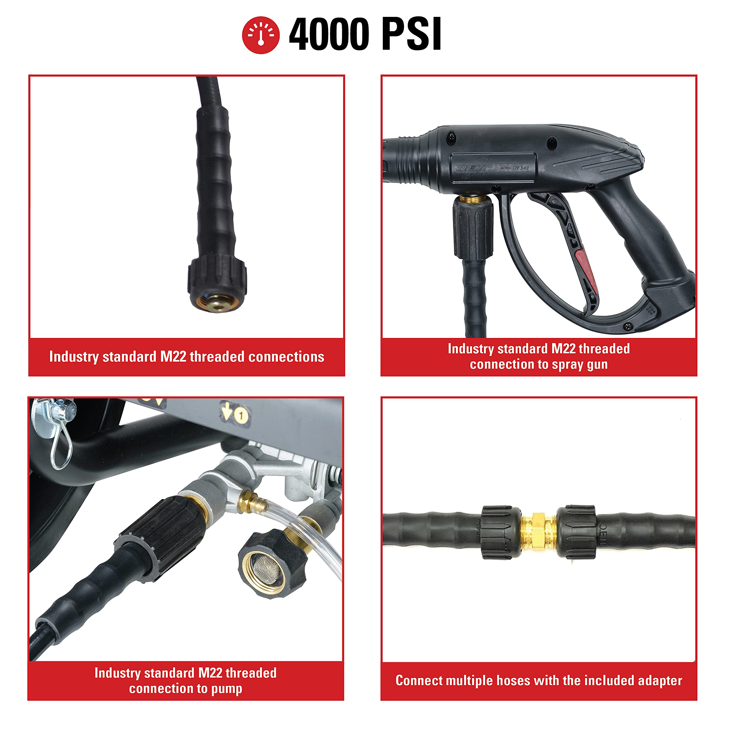 Easy Connections: This hose includes industry standard M22 threaded hose connections, and can be used with pressure washers up to 4000 PSI; can be used as a replacement for your original hose or, with the included adapter, as an extension to your existing hose