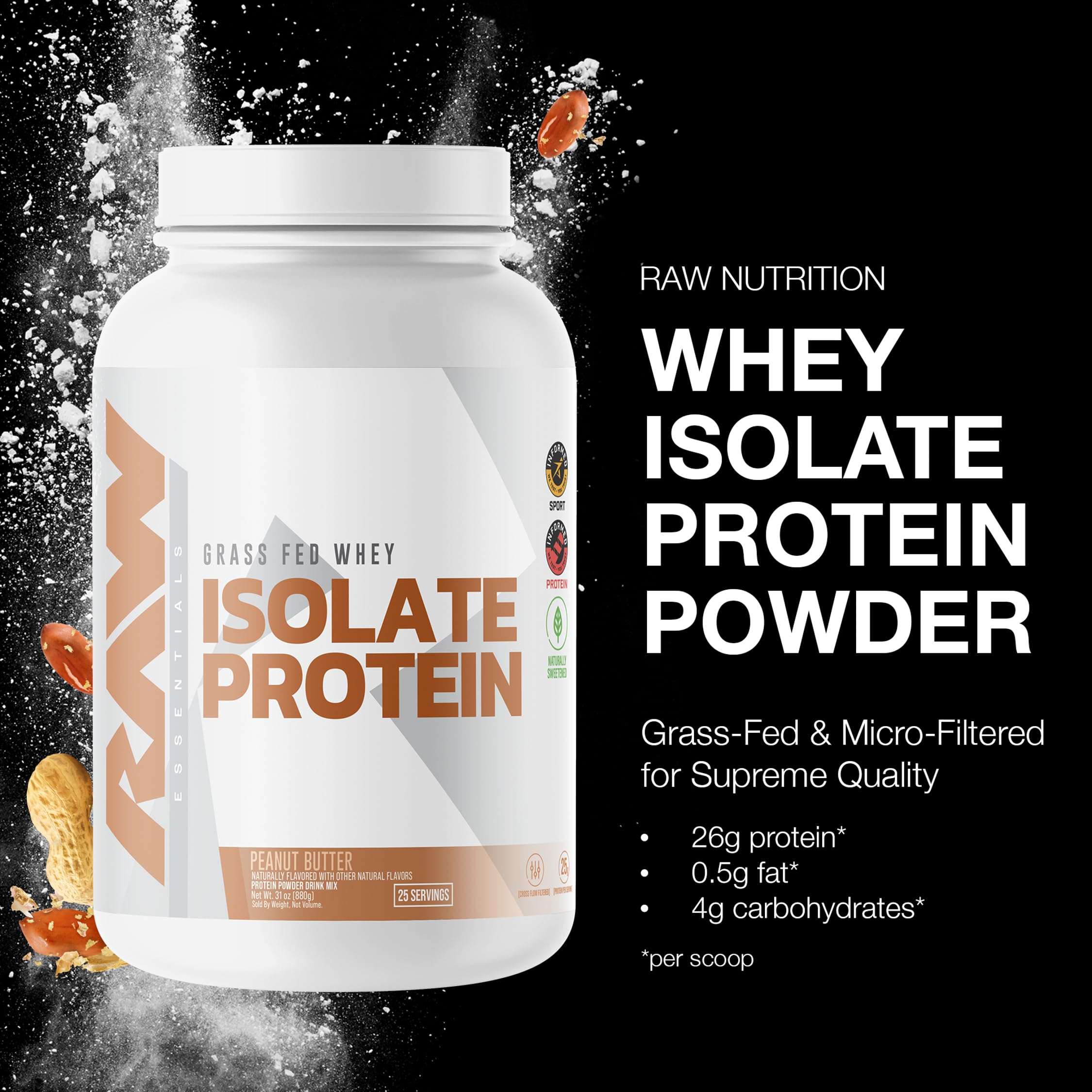 Peanut Butter Grass-Fed Whey Protein Powder: RAW Nutrition brings you our grass-fed micro-filtered isolate protein, complete with naturally occurring Branch Chain Amino Acids (BCAA). Each scoop packs 25 grams of protein with 0.5g of total fat and 1 gram of carbohydrates. 1.98 lbs.