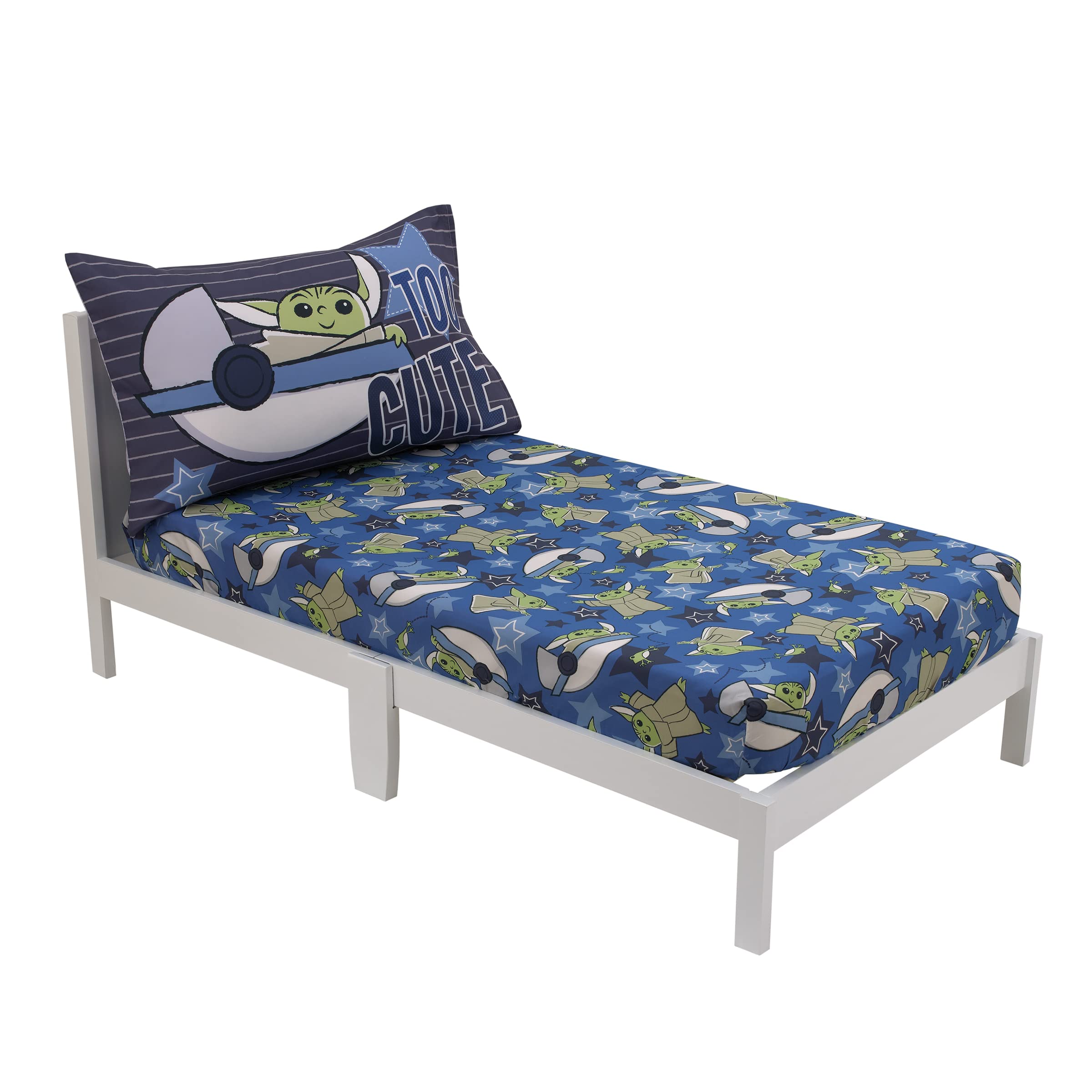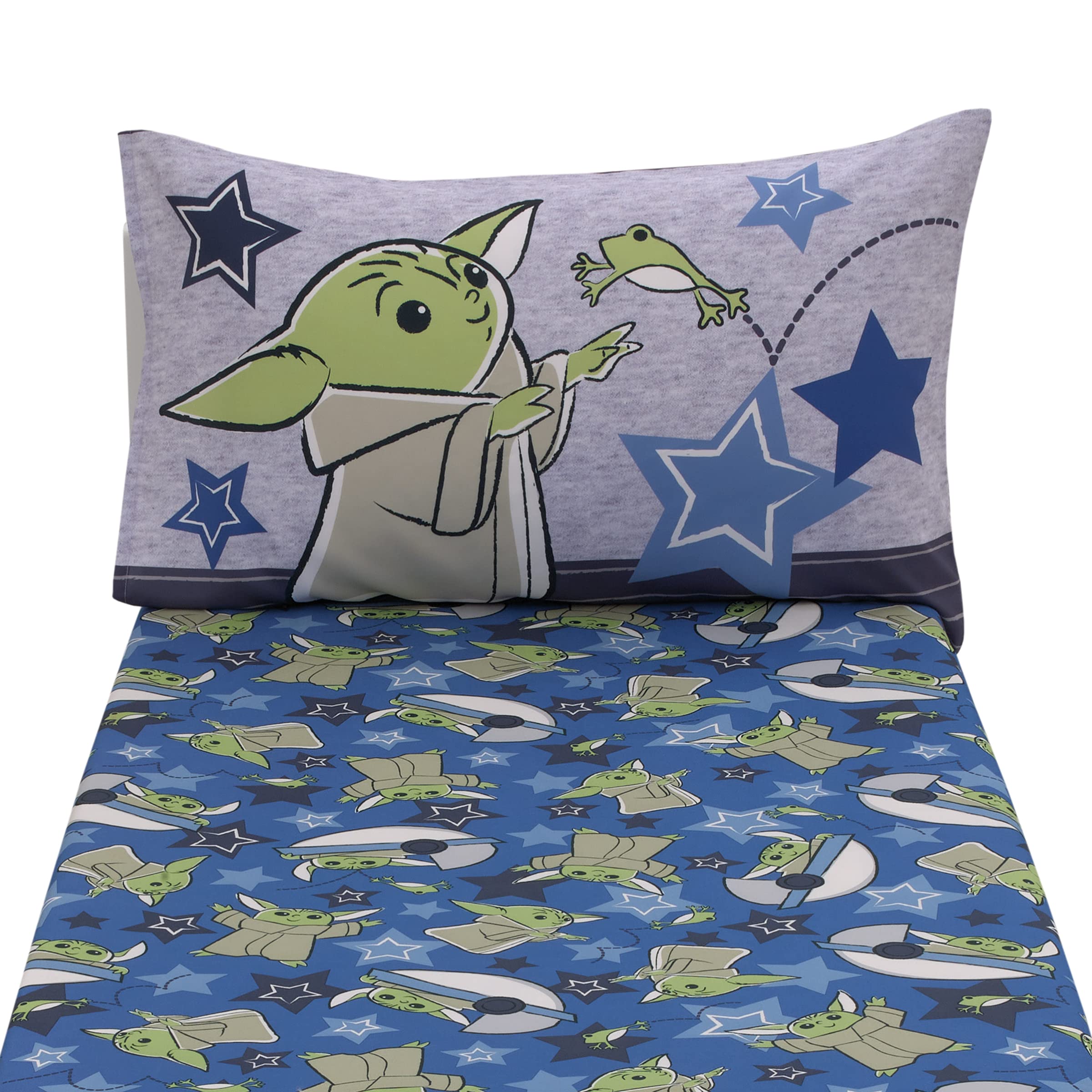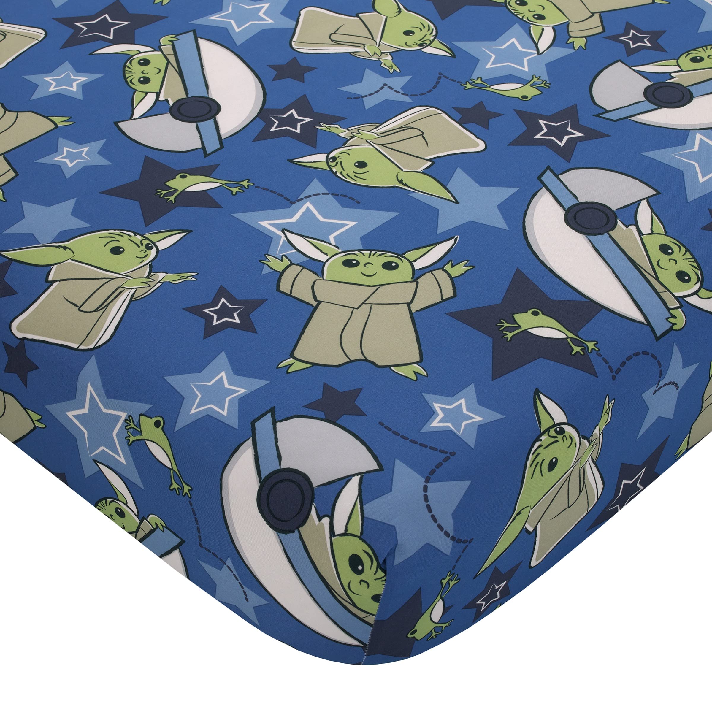 The Child Cutest in the Galaxy 2 Piece Toddler Sheet Set includes a fitted bottom sheet and reversible pillowcase. Features "Too Cute" Grogu, his hover pod, Sorgan Frog, and stars! Designed in shades of blue, green, gray, and navy. Made of super soft fabrics for a snuggly sleeping surface. The 20" x 30" pillowcase is reversible, and the fitted sheet measures 28" x 52" x 8". Fits a standard size crib/toddler mattress. Includes full elastic edges for a safe and snug fit. Coordinates with Star Wars Mandalorian The Child Cutest in the Galaxy toddler bedding and accessories.