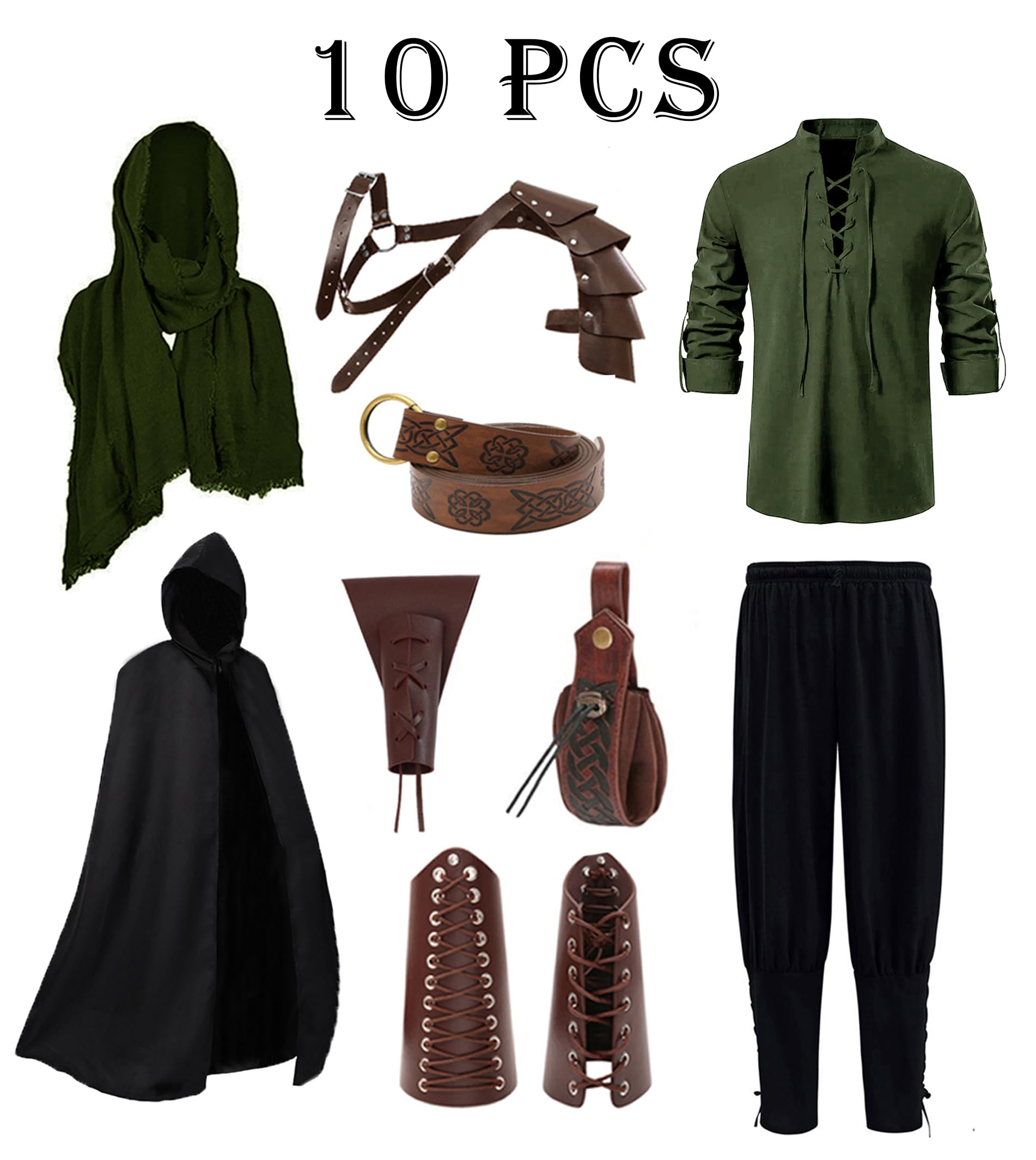 The package include 10 pieces: a pirate shirt, a bare belt trousers, a scarf, a cape, a viking belt, a retro waist bag, 2 buckle wrist guards, a Leather pauldron, a sword holster