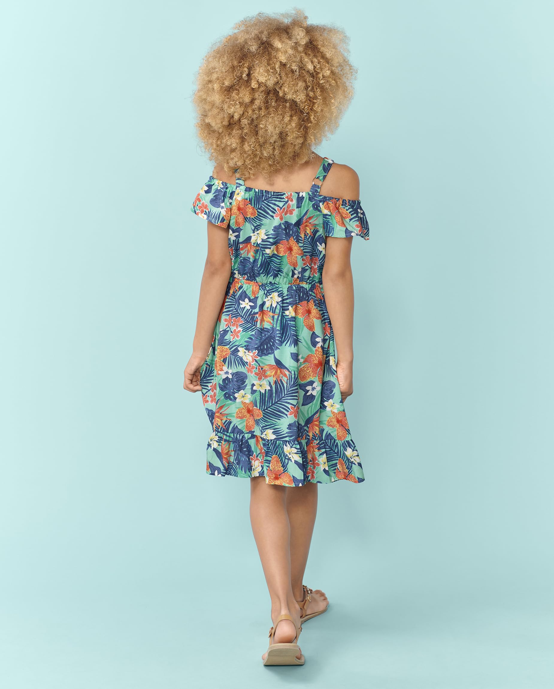 DESIGN — Features short flutter sleeves, off shoulder neck, tiered body, above-the-knee length and allover tropical floral print