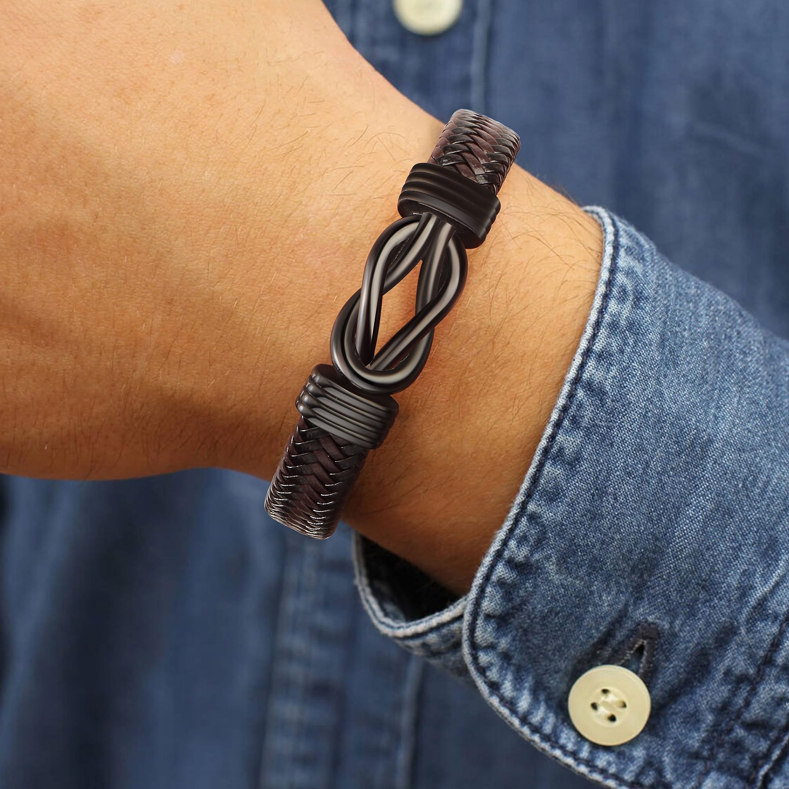 🎁【 Materia & Size】 The knot bracelet is made of superior leather and stainless steel, and the mens leather bracelet is soft and comfortable. The inner - circle dimension of this bracelet is 9 inches. Note: Our bracelets are handmade and there will be a 0.1 - inch deviation.