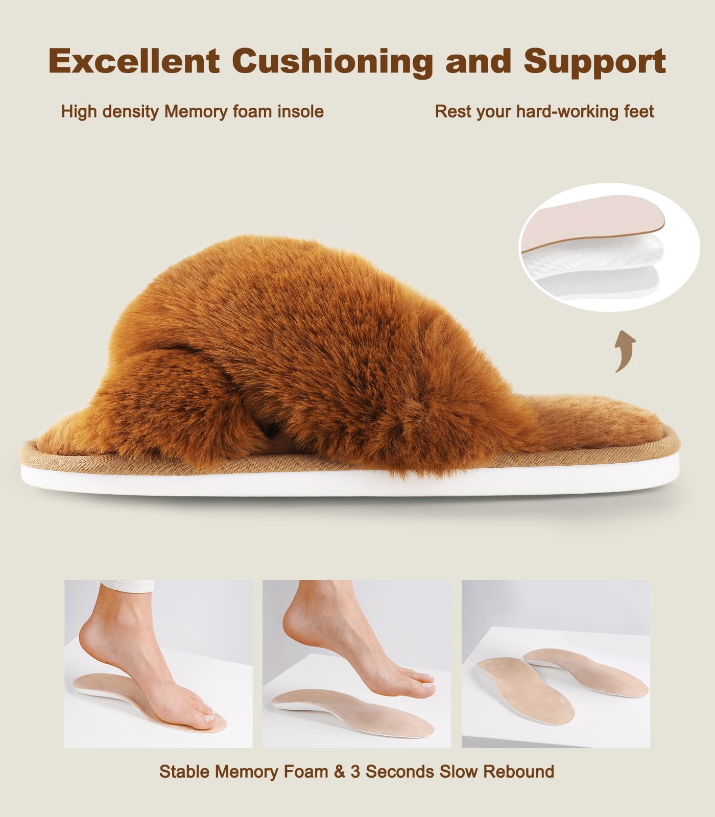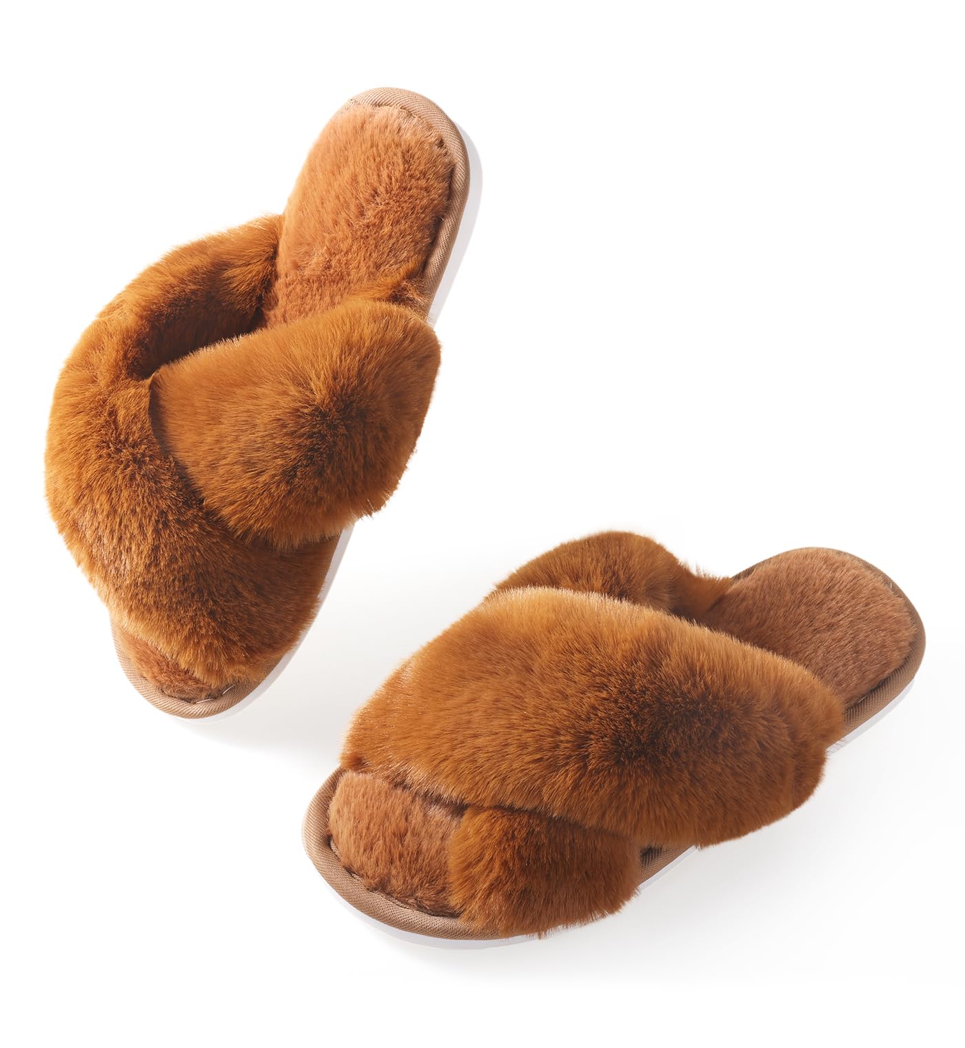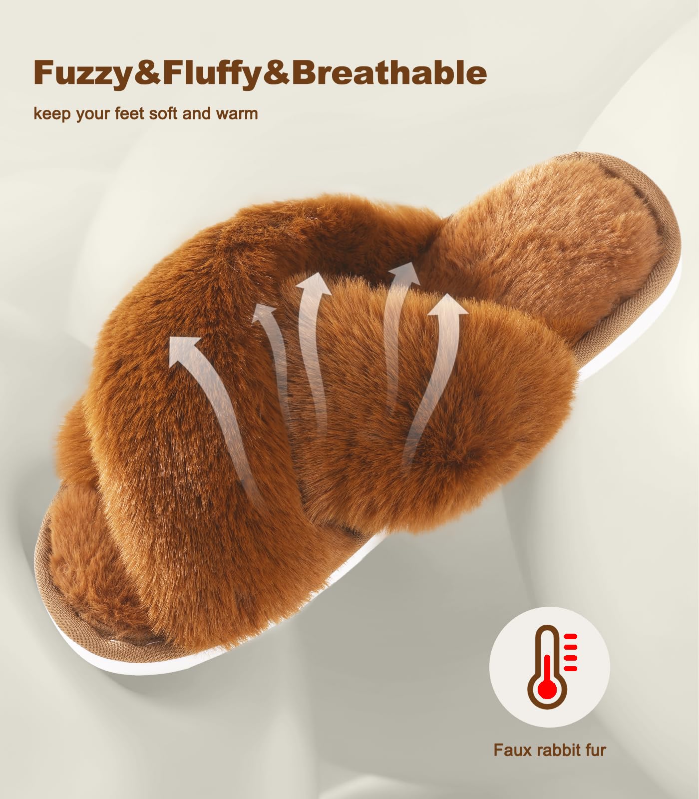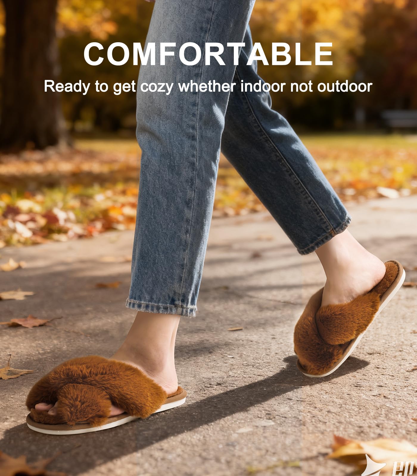 Chic Must-Have Slippers for Women: Ankis fuzzy slippers feature a trendy cross-band design that looks cute and stylish. The open-toe style makes them easy to slip on anytime. Soft plush faux fur keeps your feet cozy while staying breathable for all-day comfort at home