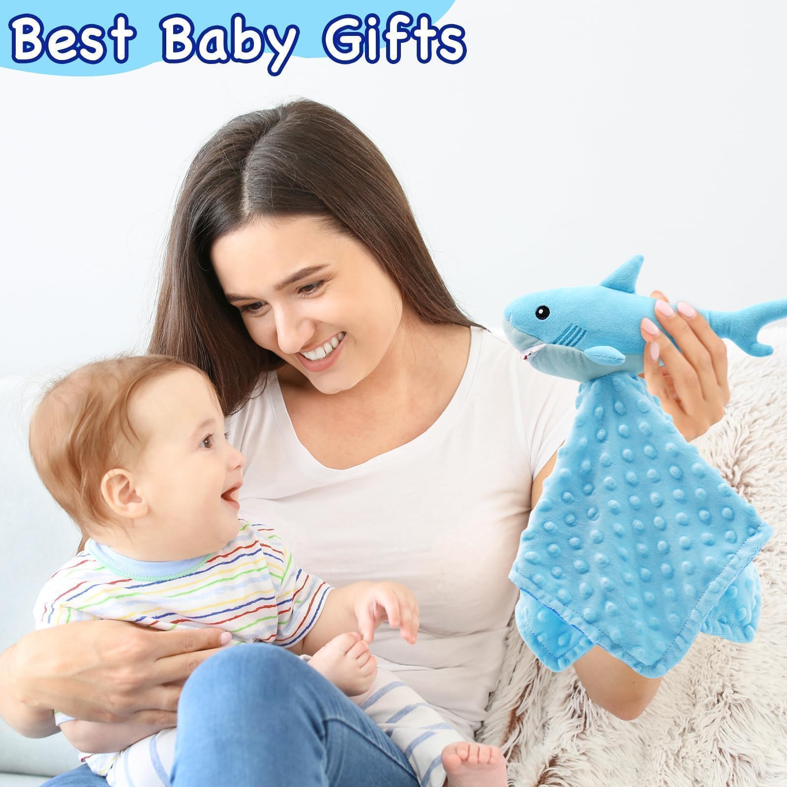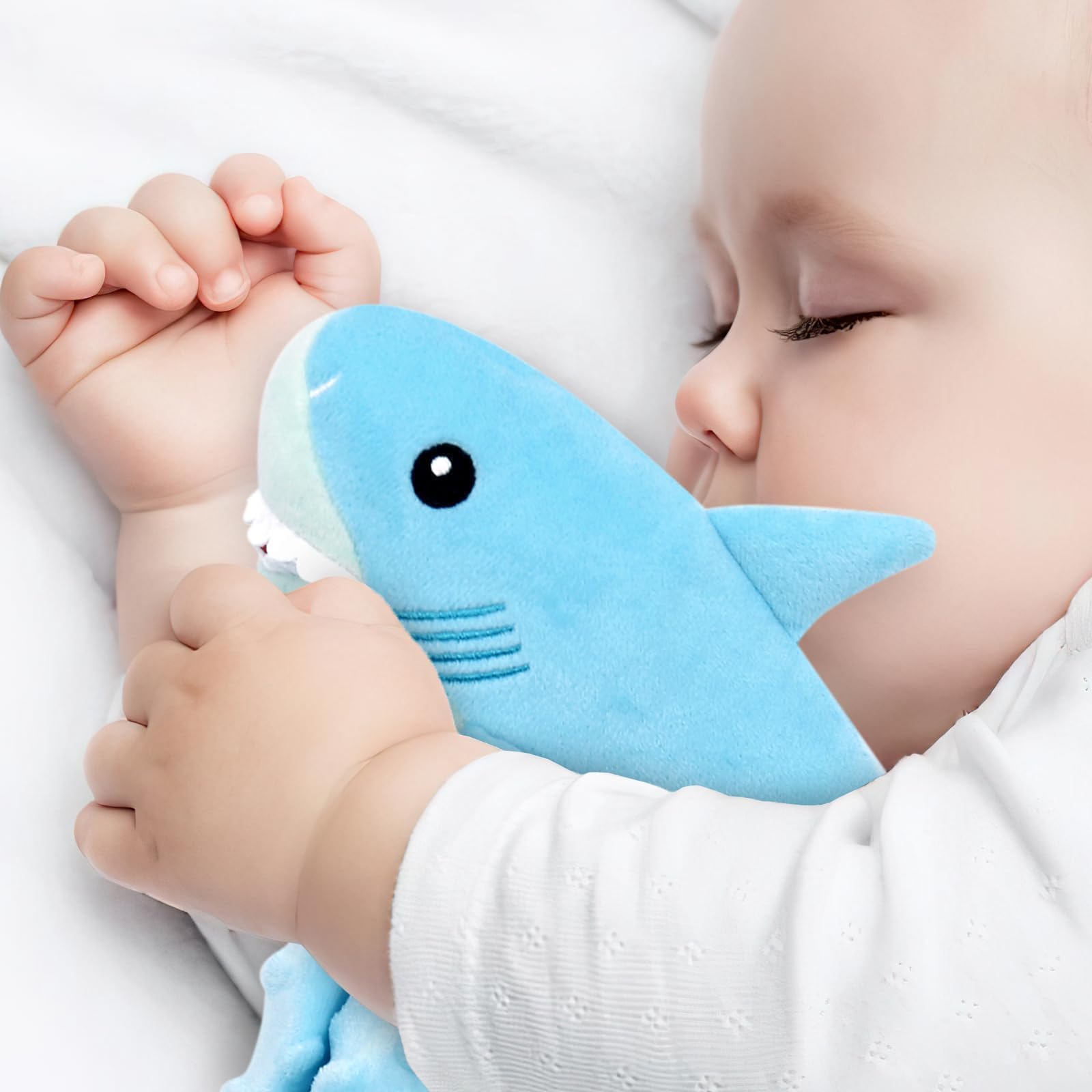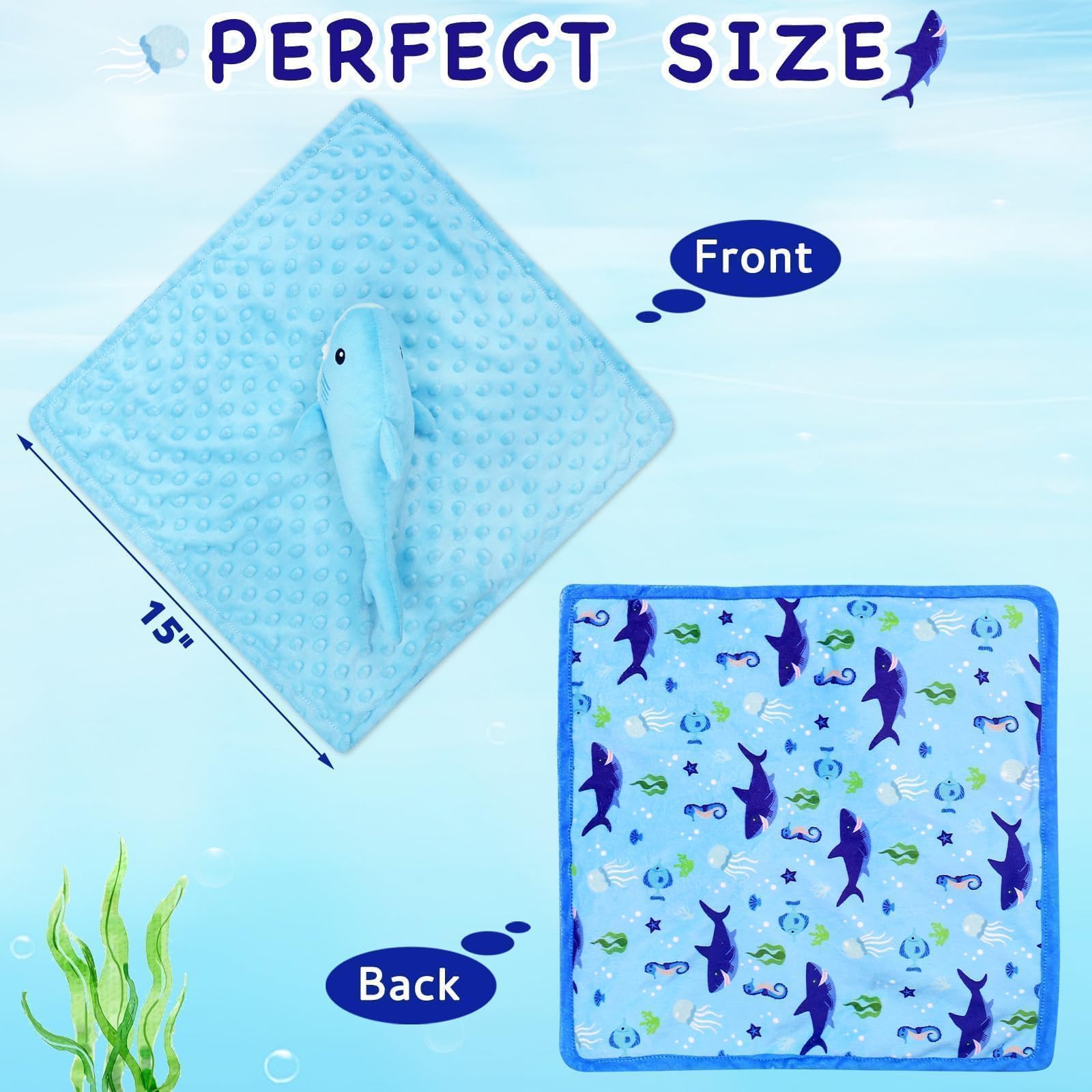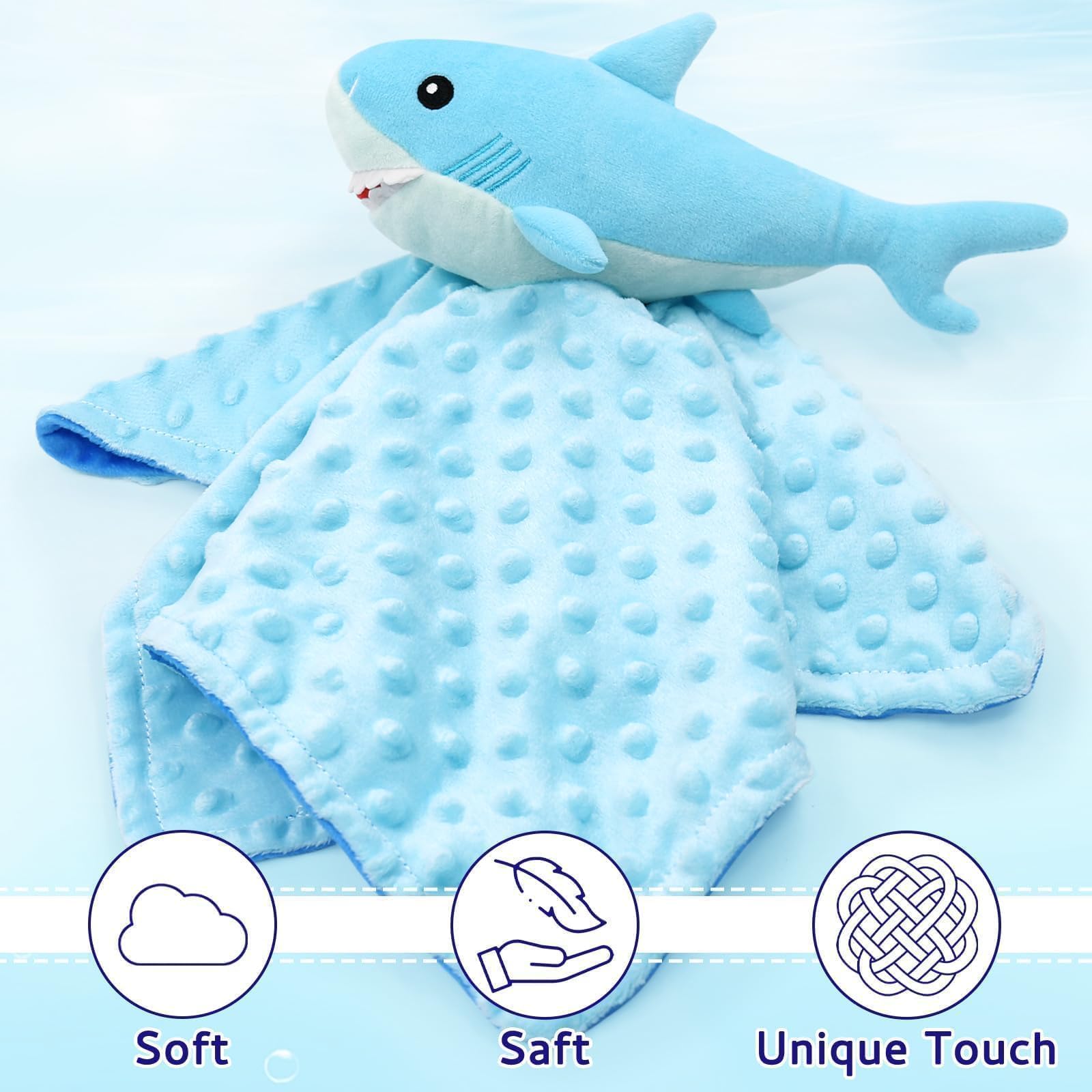 BABY GRASPING: A stuffed shark with a 15"x 15" square shark theme blanket. A stuffed animal and lovey blanket all in one. The shark is 4.1 inches tall, and the size from his head to body is about 9.1 inches wide. The top of the shark's first dorsal fin to the bottom of a blanket measures about 13.8" in height. Just the right size to carry in the car, and it will easily fit into a backpack or diaper bag.