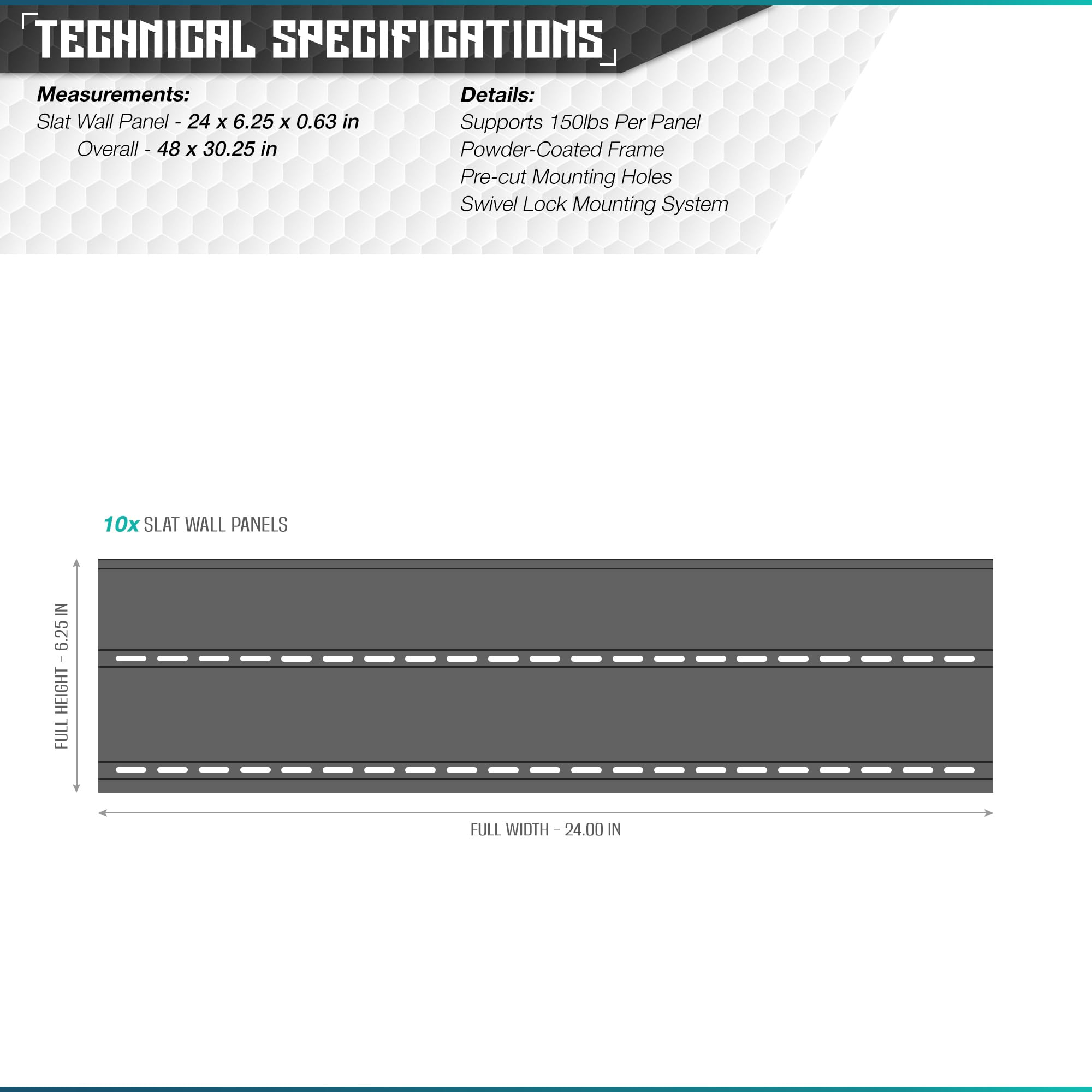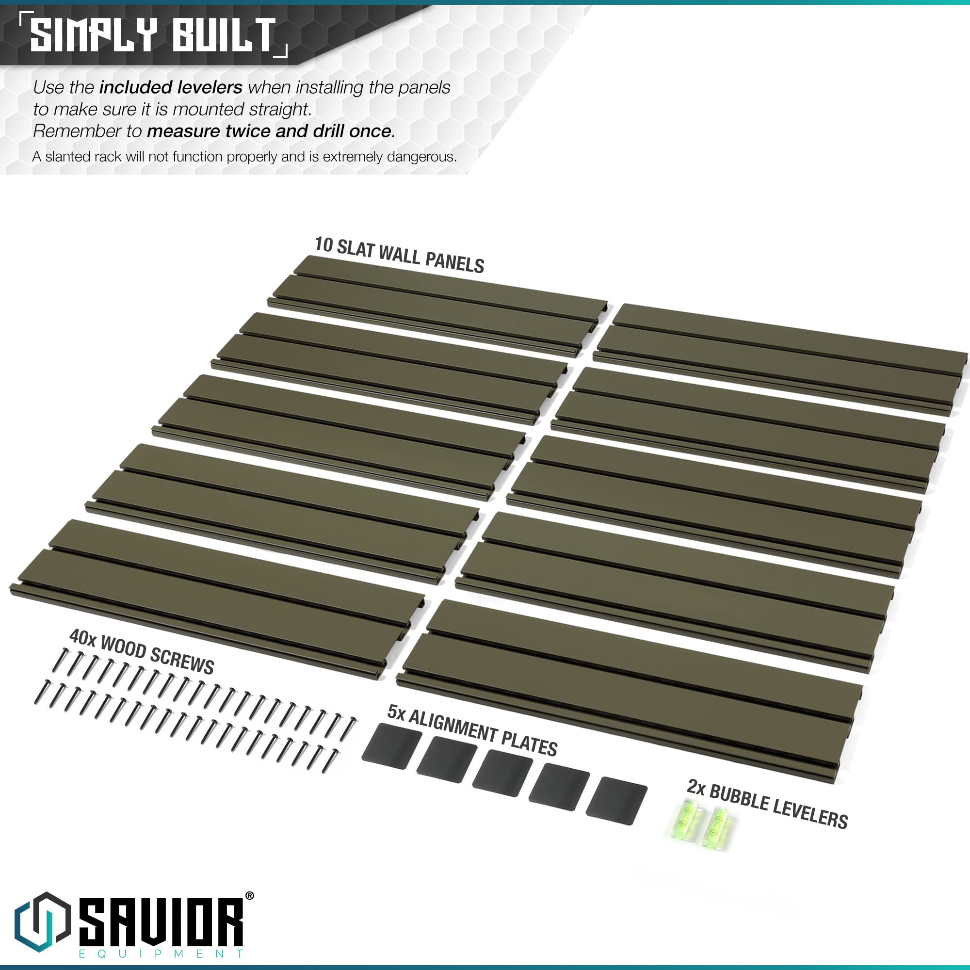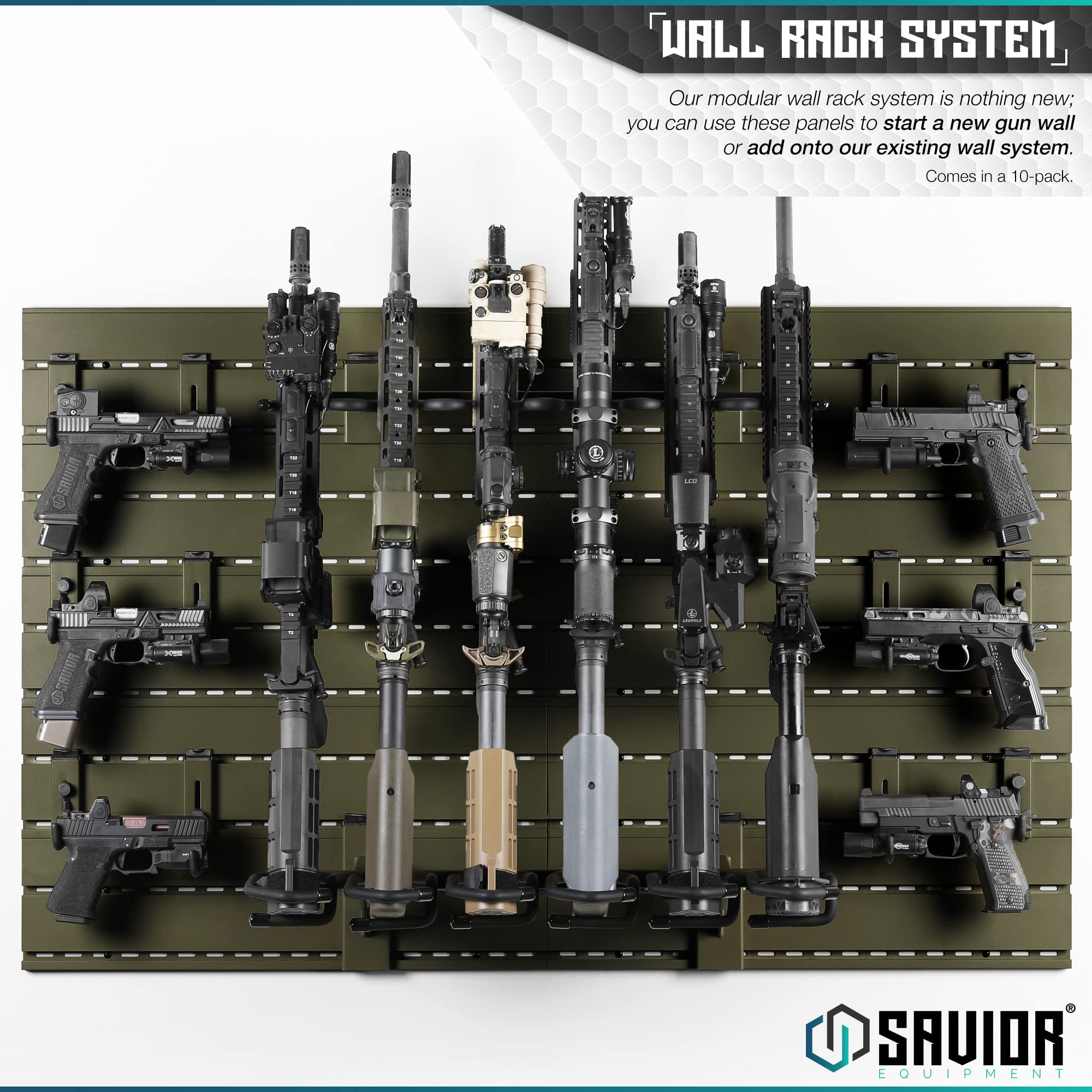 Savior Equipment Wall Rack System Modular Firearm Wall-Mount Storage Organizer - Slatwall Only What is Included 5 or 10 x Slat Wall Panels of Your Choice Product Features Wall Rack System Our modular wall rack system is nothing new; you can use these panels to start a new gun wall or add onto our existing wall system. Comes in a 5/10-pack. Anchored Down Made from steel, these panels have pre-cut mounting points along all the rails, which are spaced 3" on-center. Accessories not included Lining It Up The included alignment plates assist in keeping your panels horizontally level, so accessories can work across each installed panel. We recommend using the plates for installation. Standardized Design Infinitely expandable to accompany your ever-growing collection of firearms, bows and swords. Accepts most accessories made for 3" on-center slat walls. Additional accessories not included. Simply Built Use the included levelers when installing the panels to make sure it is mounted properly. Remember to measure twice and drill once. Technical Specifications Slatwall Panel Size (each) | 24.0" W x 6.25" H x 0.63" D Detail: Supports 150lbs Per Panel Powder-Coated Frame Pre-Cut Mounting Holes