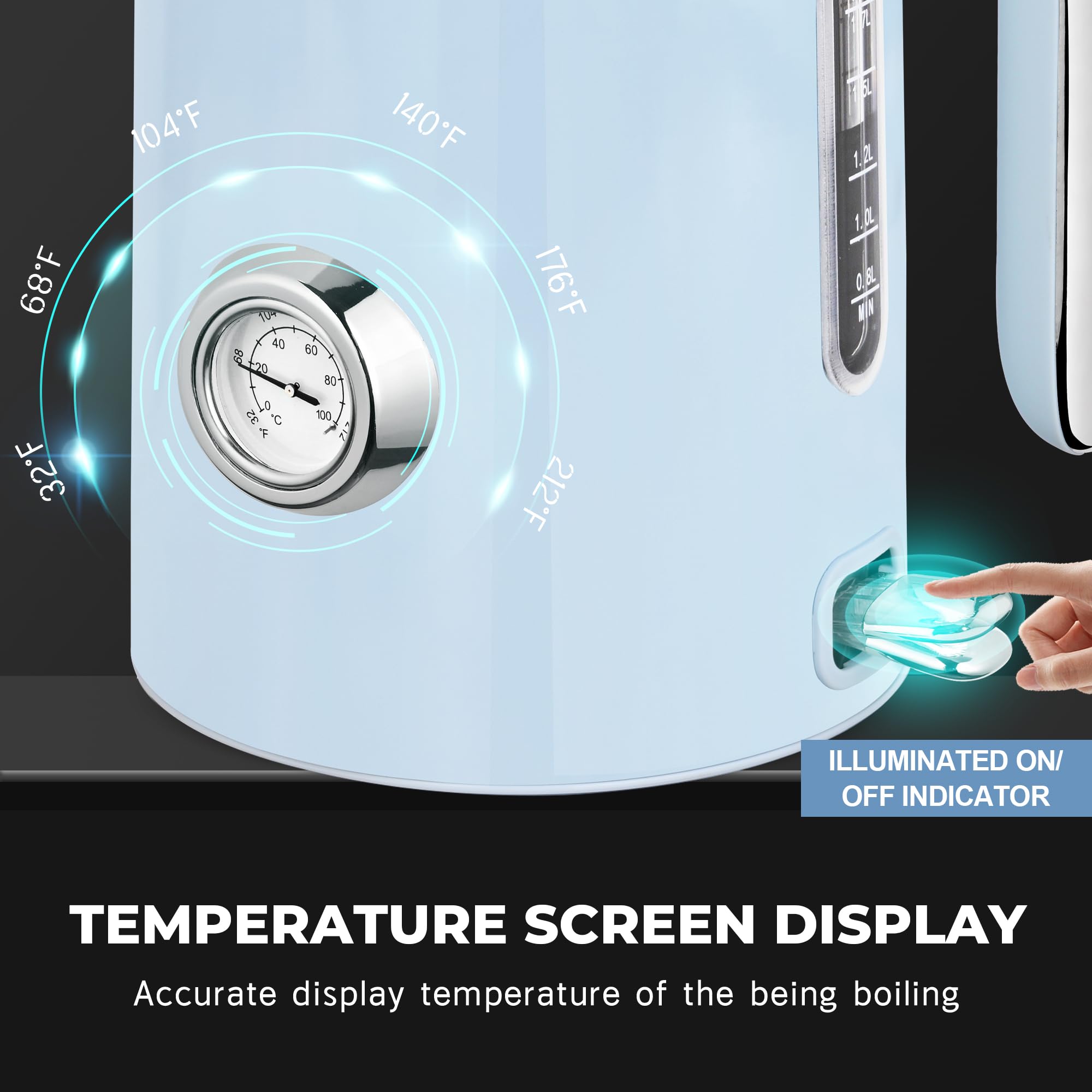 ECO-FRIENDLY MATERIALS | BUILT TO LAST: The interior of the blue electric kettle is made of 18/8 stainless steel (including spout and lid), which greatly improves durability and safety. All plastic components that come into direct contact with water are devoid of BPA, ensuring your safety and reassurance. The exterior surface is treated with electroplating paint, which is wear-resistant and scratch-resistant, making it easy to maintain
