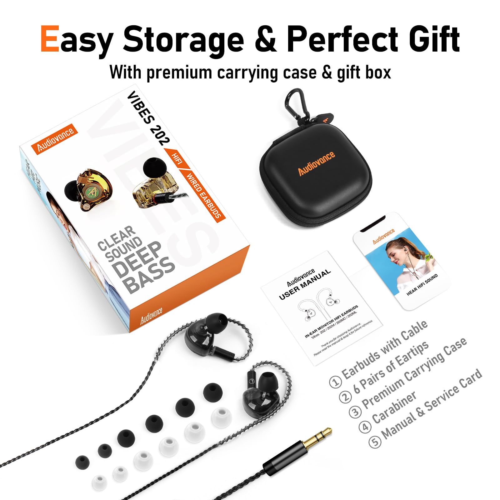 What's in the Box: Vibes 202 black HiFi wired earbuds with silver-plated cable, 6 pairs of eartips, carrying case, carabiner & user manual.