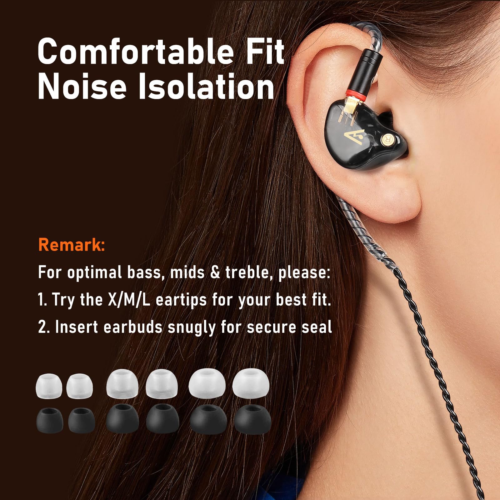 COMFORTABLE FIT & NOISE ISOLATION - Ergonomically designed to fit the ear canal, Vibes 202 IEM headphones feature preformed over-ear earhooks for a secure fit and keep cables out of the way. With 6 pairs of soft, breathable eartips (in 2 colors and 3 sizes), they ensure optimal comfort and stability while effectively blocking ambient noise for immersive listening.