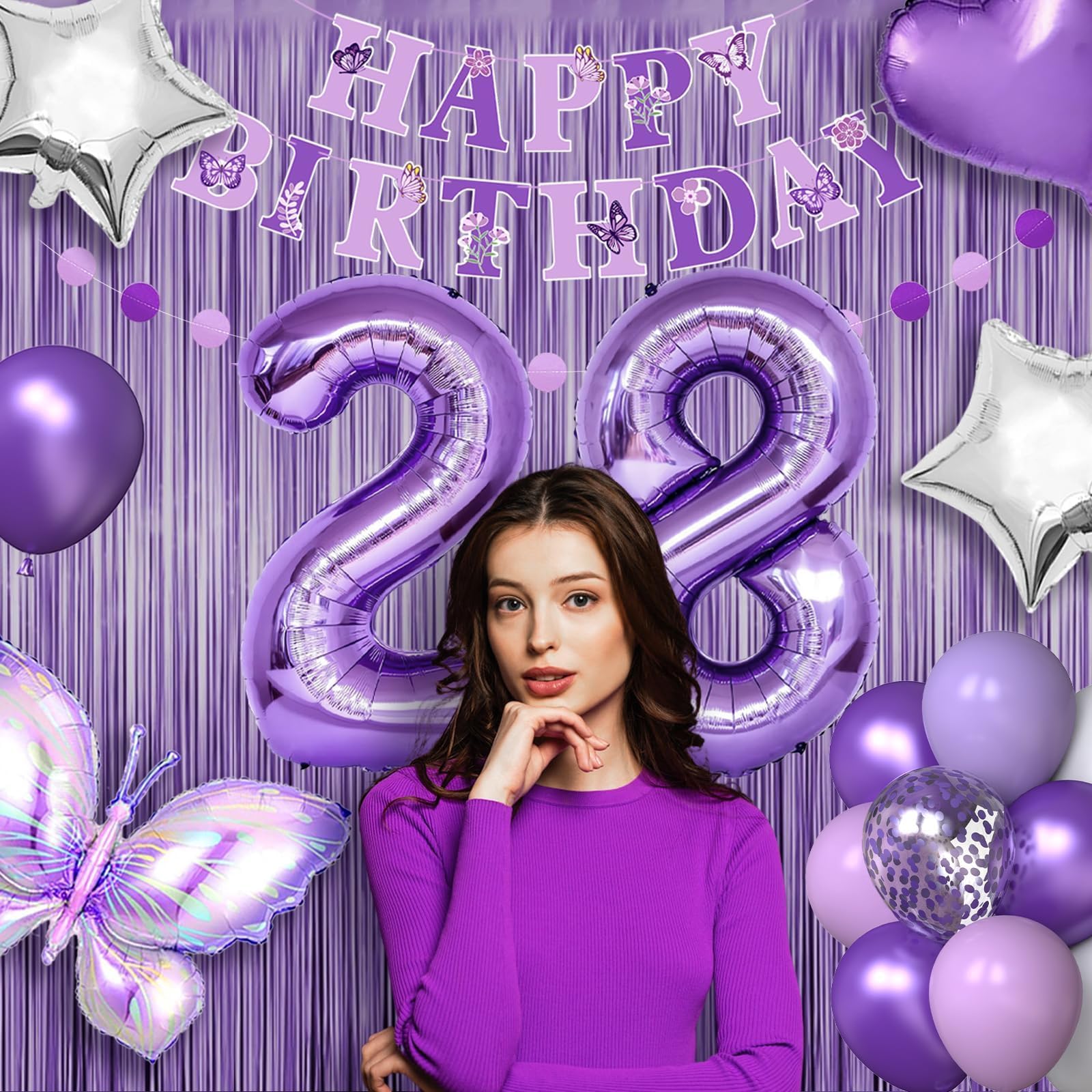 Wonderful Purple Butterfly Theme Decorations for Women's 28th Birthday Party: There are beautiful purple pink balloons for making a balloon arch. Lavender purple décor looks romantic and mysterious after assembled, will bring your families, friends an unforgettable memory!