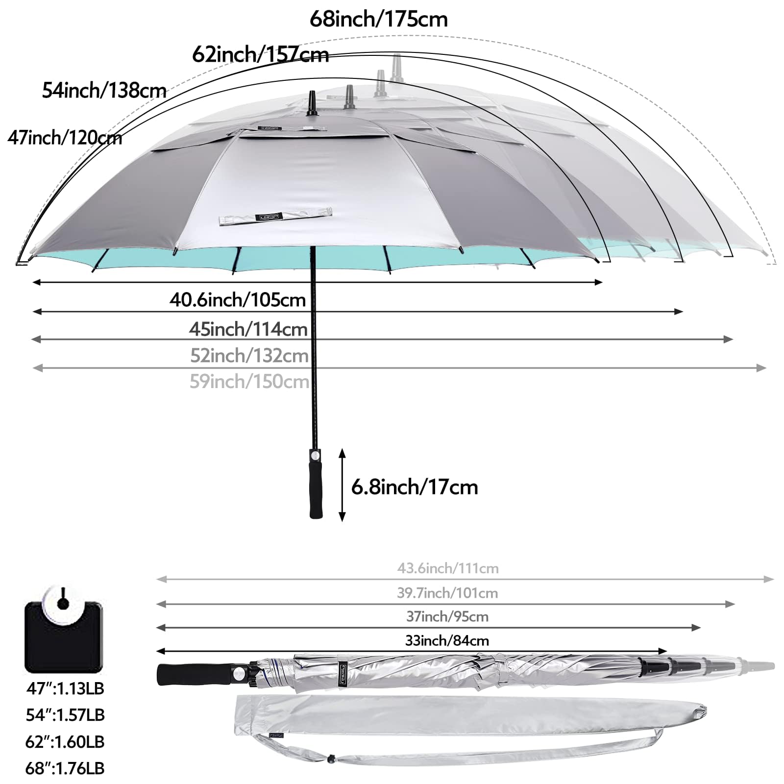 47-Inch Large Umbrella. The canopy has a 47-inch arc and a diameter of 40.6 inches. This G4Free large umbrella is big enough to protect one or more people. When closed, it is 33 inches long and weighs 1.13 lb. Suitable for men, women, or couples.
