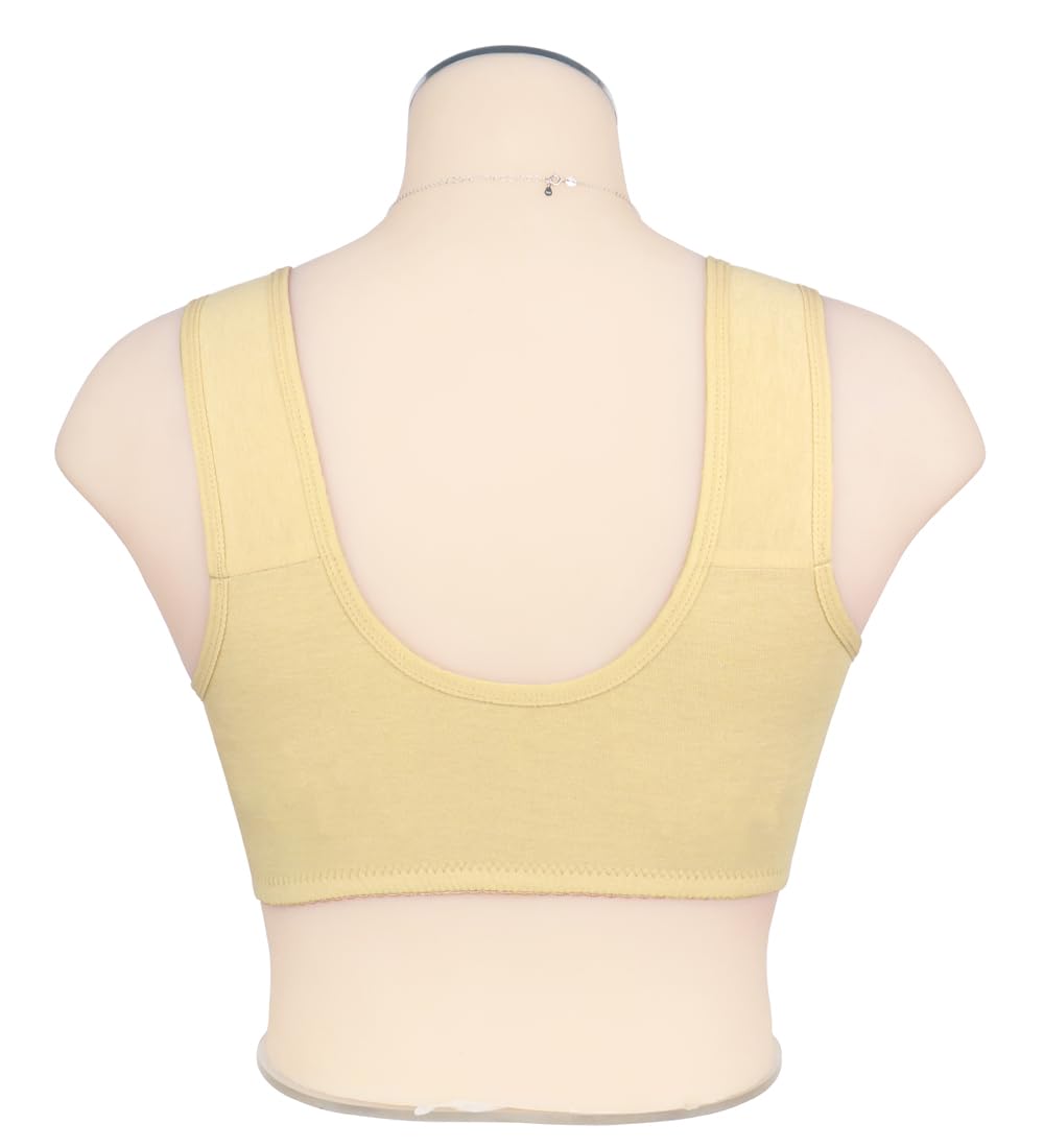 No underwire, Higher sides, Fuller cups, Wider straps, With daisy embellishments.