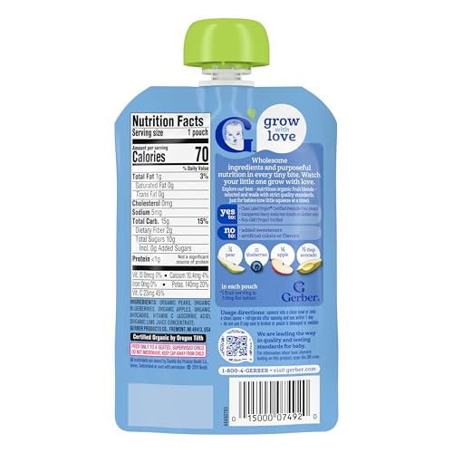 CONVENIENT BABY FOOD: Our Gerber Organic Pear Blueberry Apple Avocado Puree Pouch is designed for ease and convenience. This Gerber baby food is portable, re-closeable and easy-to-store, for busy parents