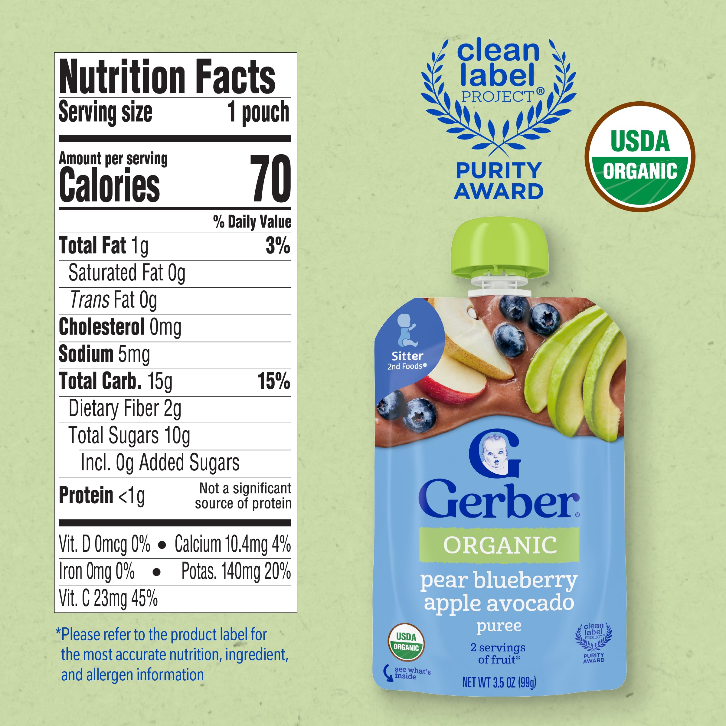 PUREED FRUIT: With your child in mind, this Gerber baby food offers a delightful blend of 1/4 pear, 15 blueberries, 1/6 apple, and 1/2 tbsp of avocado