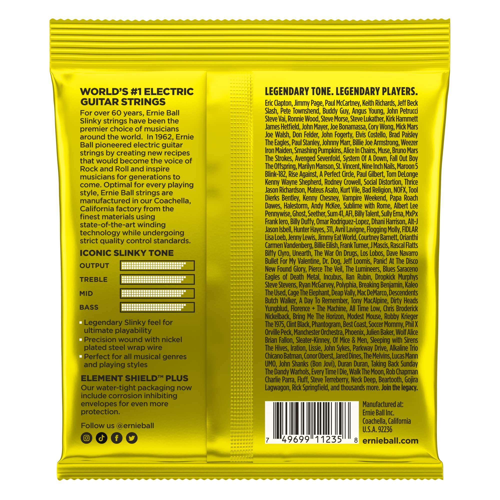 Now available in convenient three-set packs Ernie Ball Beefy Slinkys are optimal for detuning. These electric guitar strings are precision manufactured to the highest standards and most exacting specifications to ensure consistency, optimum performance, and long life. Beefy Slinky wound strings are made from nickel-plated steel wire wrapped around a hex-shaped steel core wire. The plain strings are made of specially tempered tin-plated high-carbon steel for that iconic Slinky feel and tone that players have relied on for decades. Beefy Slinky gauges are .011 .015 .022p .030 .042 .054.