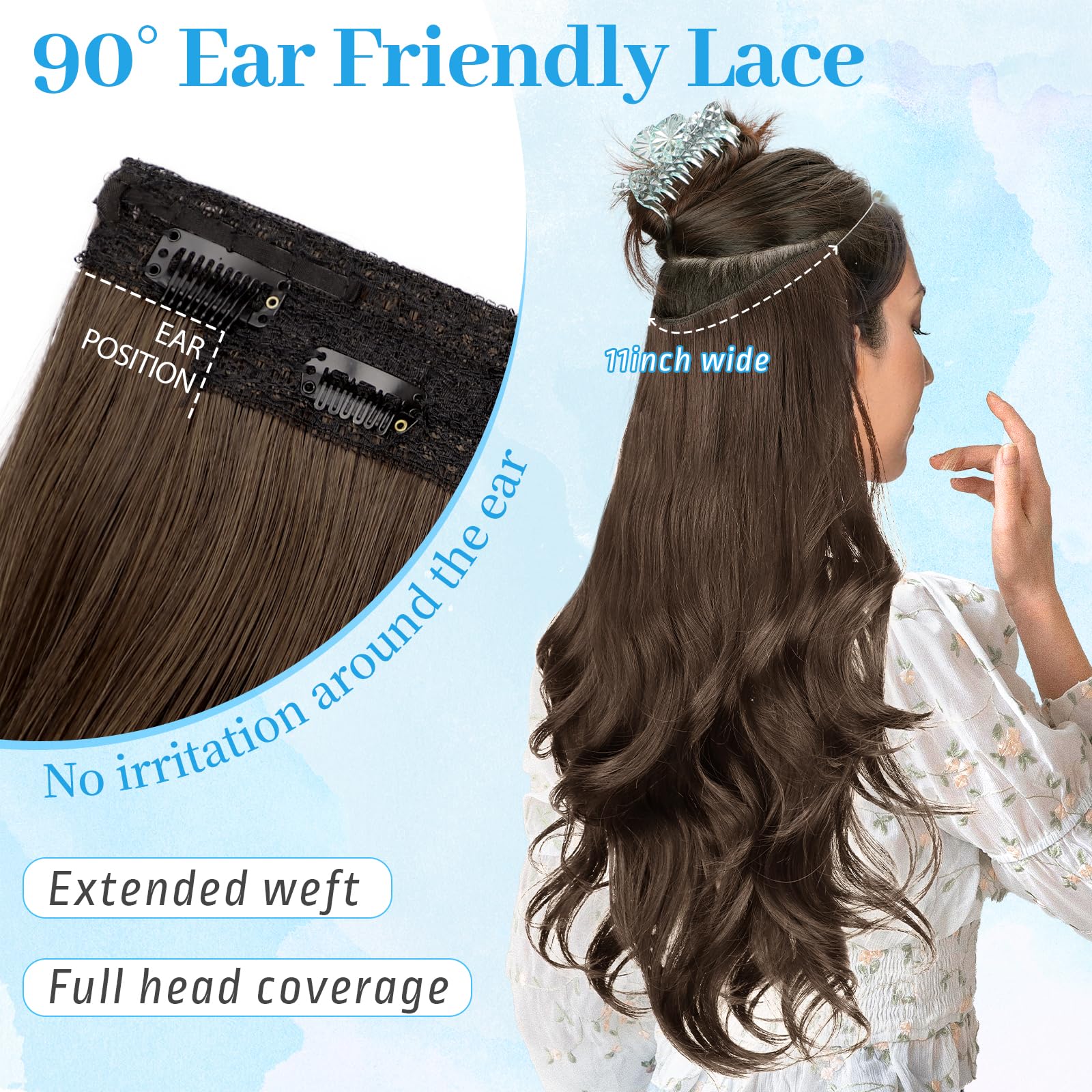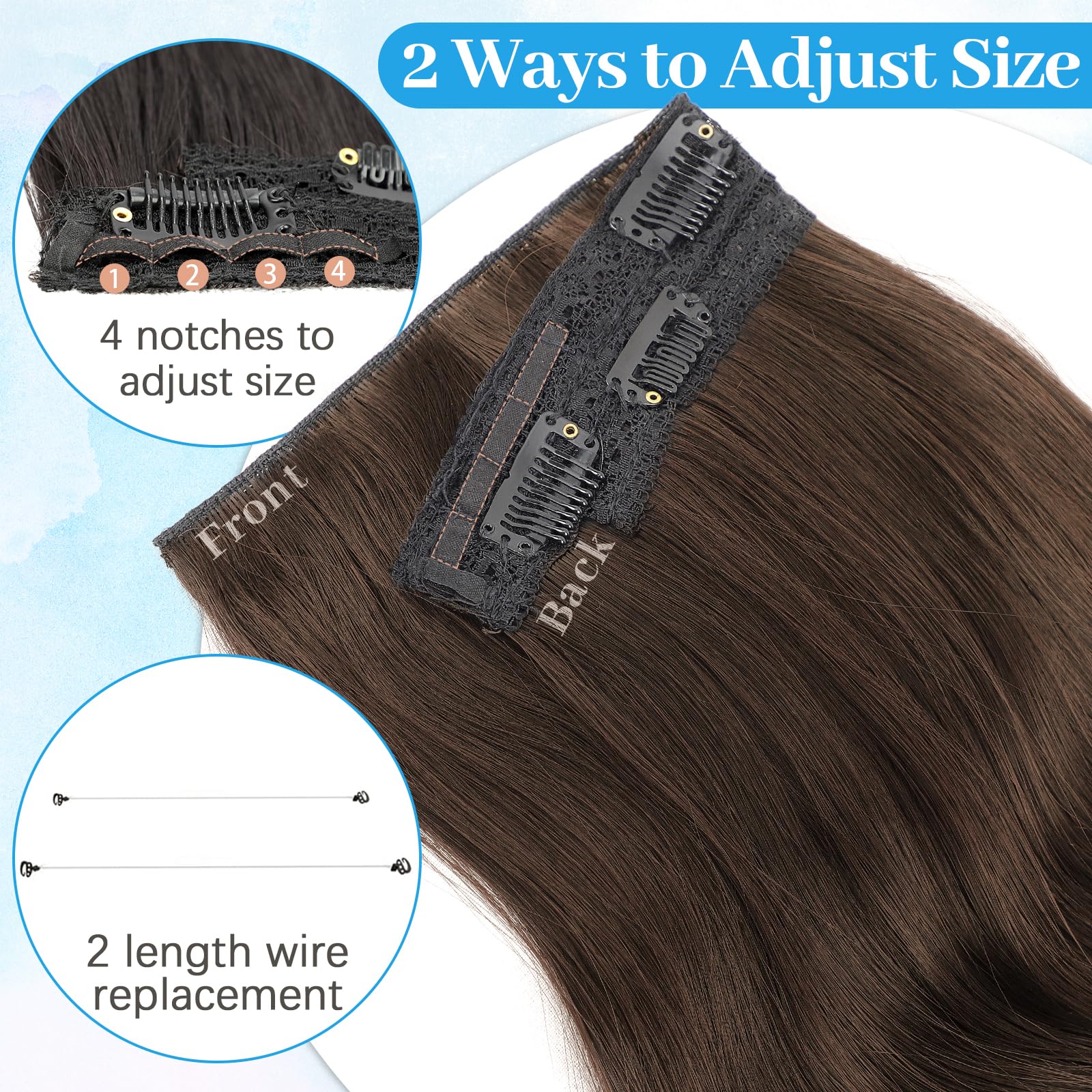 【Easy to Wear】Just 3 steps increase your hair volume quickly.Separate your hair above your ears, about 1-1.5 inches from your hairline, and leave it on top;Place the hooks in different positions to adjust the size to your head, then place the extensions with the wire in the back;Place 4 clips onto the hair for further security, then release the top of the hair;Finally, Use your own hair to hide the wire.